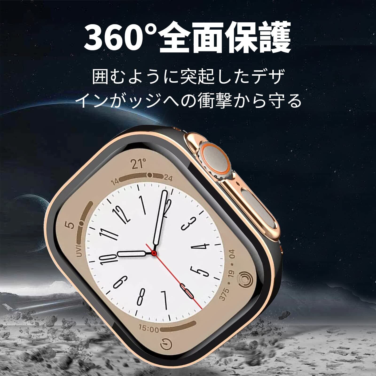 対応 Apple Watch ケース 49mm 防水ケース 3D直角エッジデザイン メッキ加工 アップルウォッチ カバー ガラスフィルム アップルウォッチ ケース 耐衝撃 apple watch カバー 全面保護 高透過率 Apple Watch Ultra2/Ultra 49mm アップルウォッチウルトラ2/ウルトラ 49mm 対応 ブラック/ゴールド