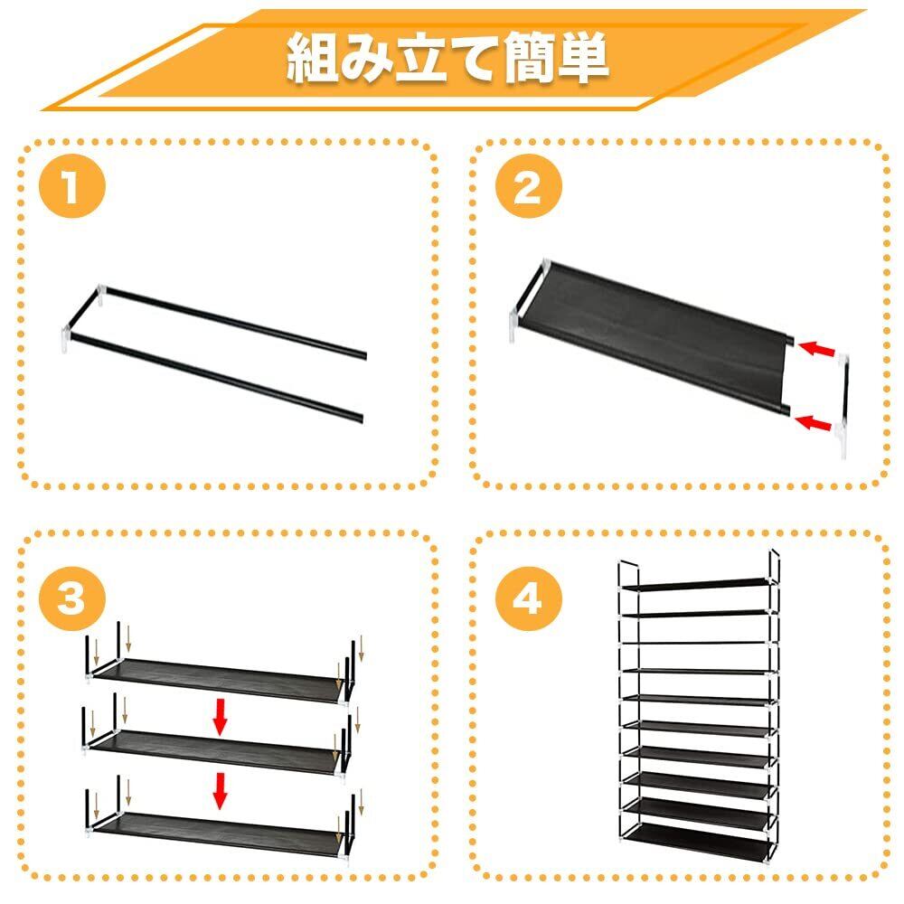 【高品質シューズラック】 1.太い鉄パイプ- 直径13mmの鉄パイプはプラスチックをコーティングした、防錆、優れた耐荷重、長く使っても変形しにくい。2.防水層付き不織布- 丈夫な高級コーティング不織布の表面に防水コーティングを施しているので、水滴と埃を布巾で拭き取れやすい。3.耐摩耗ジョイント- 高強度環境配慮型PPプラスチック材料で作られ、パイプをしっかり支えます。