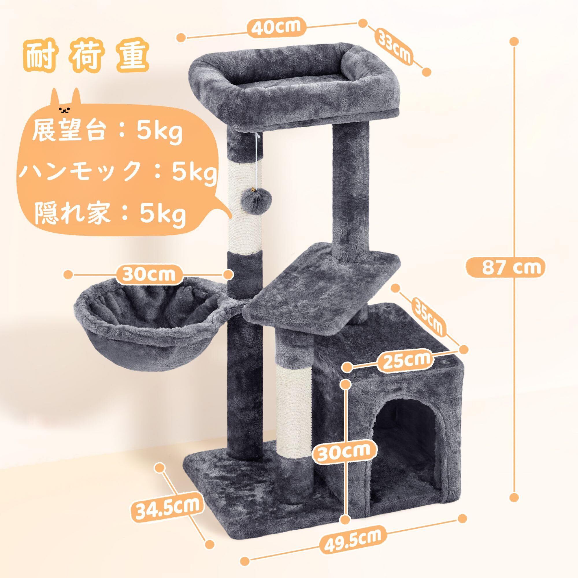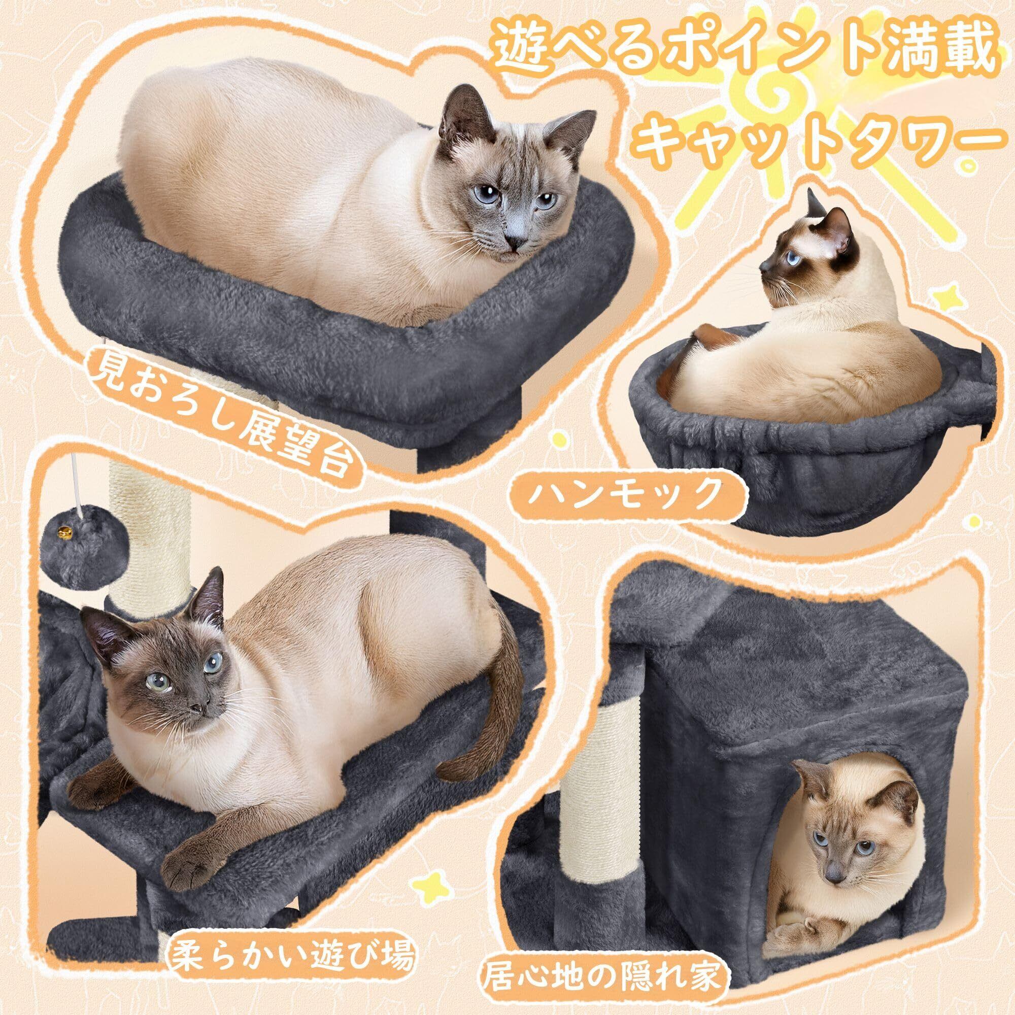 Yaheetech キャットタワー 中型 高さ87cm シニア猫 子猫 多頭飼い 猫タワー 爪研ぎ 広いハウス ハンモック 見晴台 据え置き おもちゃ付き 天然サイザル 転倒防止 (ダークグレー)
