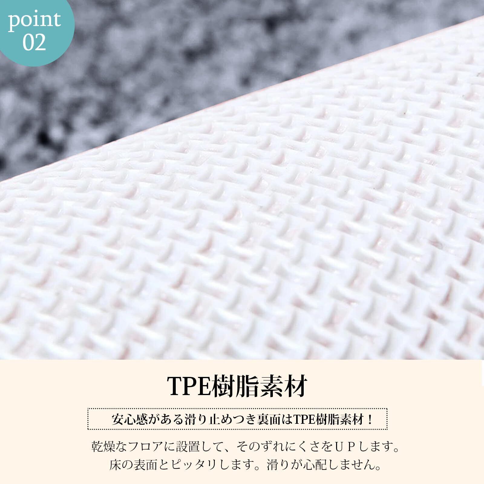 【滑り止】背面にはTPE(熱可塑性エラストマー)素材を使用しており、地面にしっかりとフィットし、万が一の転倒を防ぎます。濡れた場所でもしっかりと地面をつかむその特性は、キッチンやバスルームなどでの転倒を防ぎ、安心して使用できます。