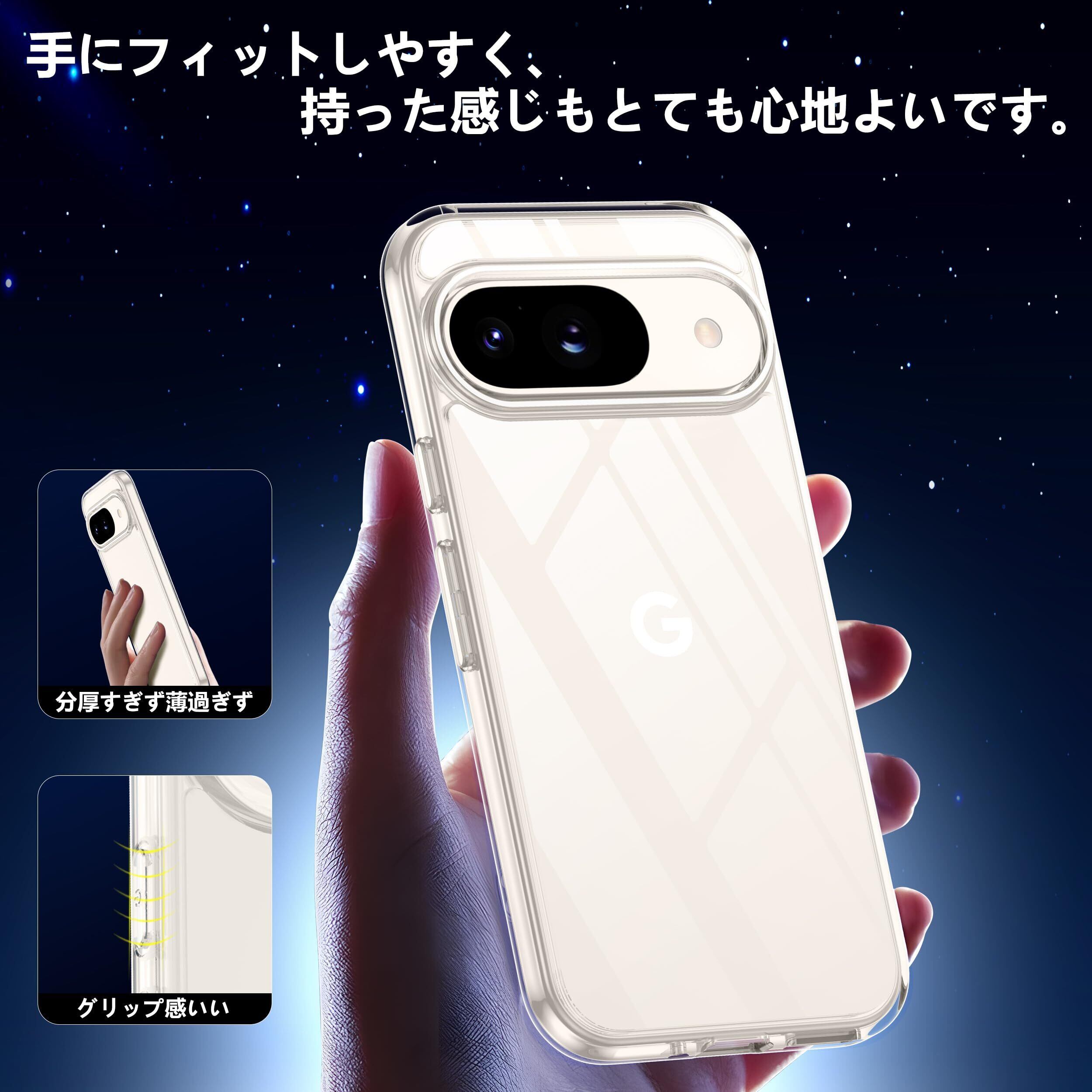 【圧倒的な透明感】透き通った高い透明度を誇り、pixel 9/9 pro本来の美しいデザインとカラーをそのままに楽しめます。耐黄変分子充填技術を採用し、常に透明感を保ち、長時間使用しても黄色に変わりません。グーグル ピクセル 9/9 pro ケースの背面は放熱性良いポリカーボネート素材で、熱を効果的に放散し、バッテリーにとても優しいです。