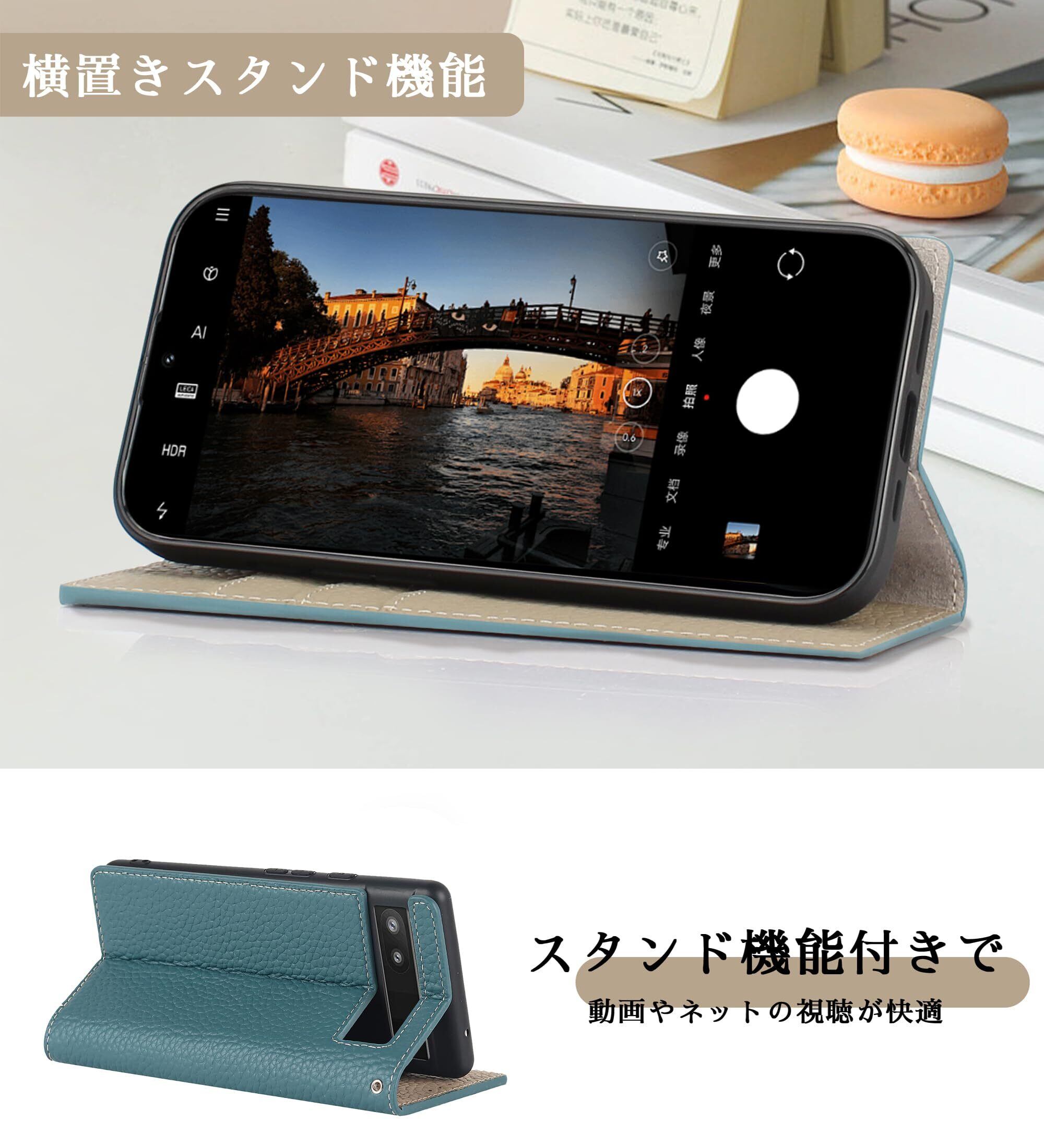 CLICSUN Google Pixel 6a 対応ケース 高級 牛本革 Pixel 6a 対応ケース 手帳型 グーグル ピクセル 6aカバー 本革 レザー カバー 全面保護 衝撃吸収 スタンド機能 ストラップ付き マグネット式 カードポケット ギフトボックス付き ブルー×グレー