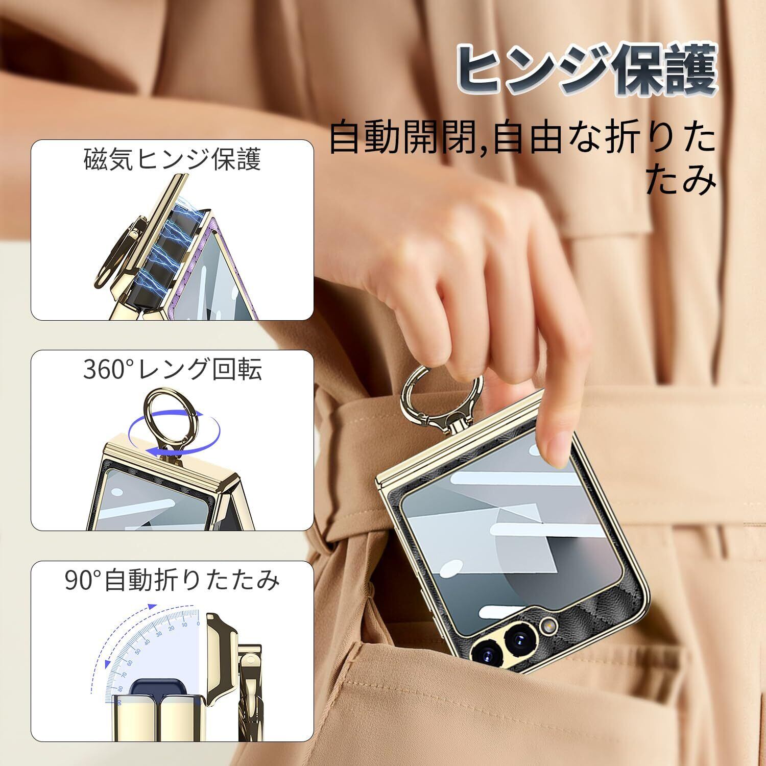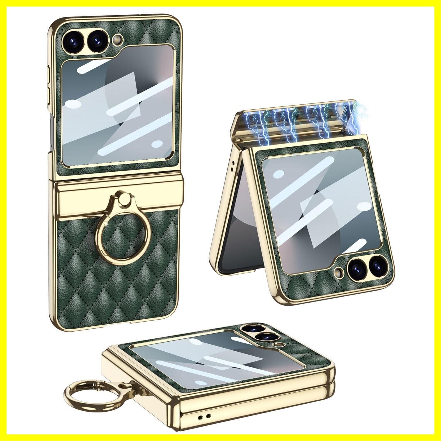 Galaxy Z Flip6 ケース 格子 360°回転リング 磁気ヒンジ ストラップホール付き 強化ガラスフィルム 折りたたみ 全面保護 メッキフレーム ギャラクシー フリップ6 保護カバー スマホケース スタンド機能 ヒンジ保護 レンズ保護 おしゃれ・グリーン