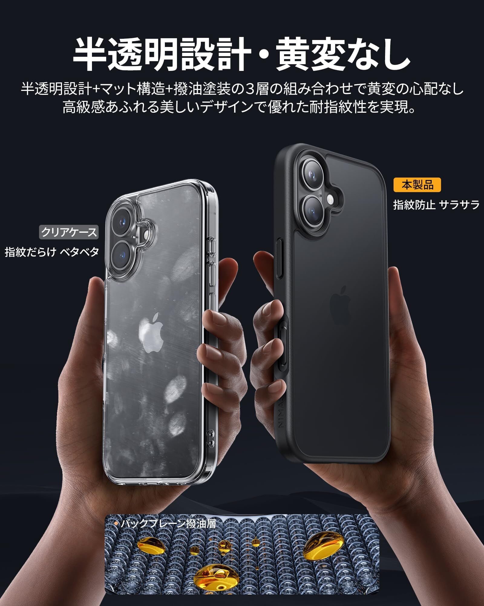 【半透明・マットな仕上げ】背面のポリカーボネートは、耐久性や耐摩耗性に優れ、マットな質感でサラサラして触り心地がすごく良いです。表面には指紋防止ナノオコーティングを施しており、指紋つく心配はありません。特に、背面は半透明で、高級感と神秘感が溢れ、いPhone16Plus用のかっこいいリンゴロゴが見えます。