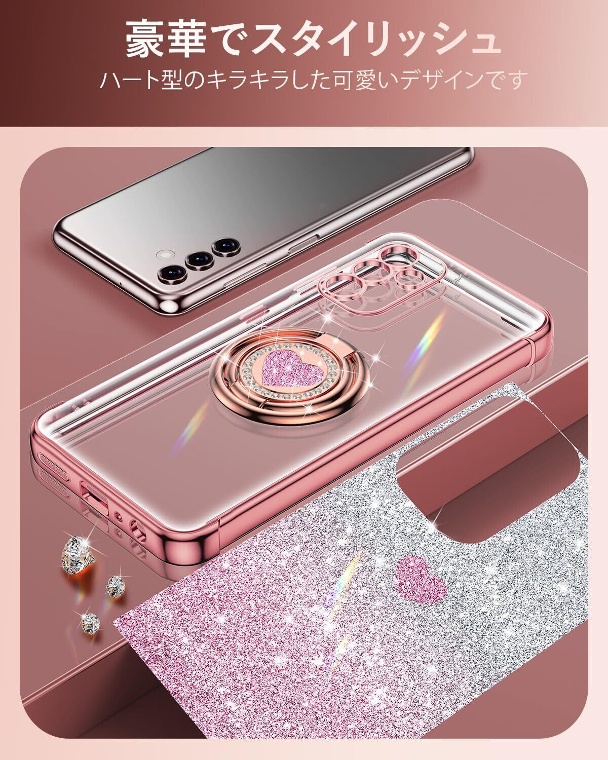 Rockaway 互換性 Galaxy S24用 ケース SC-51E SCG25 ダブルリング付き リストバンド ブレスレット付き ストラップ 耐衝撃 薄型 軽量 紐付き キラキラ ラブハート かわいい 女の子 おしゃれ 豪華 スマホケース ギャラクシー S24 用カバー - ローズゴールド