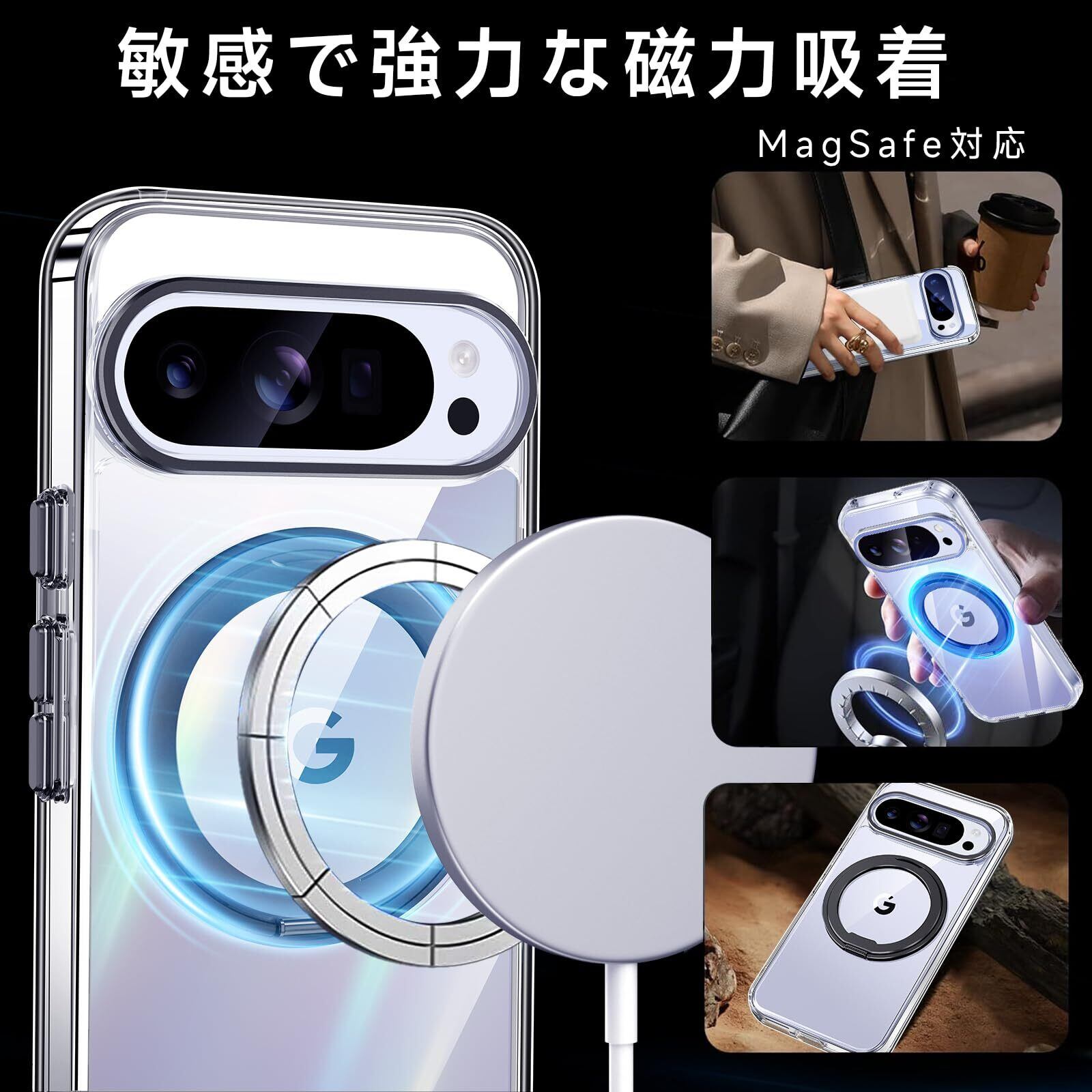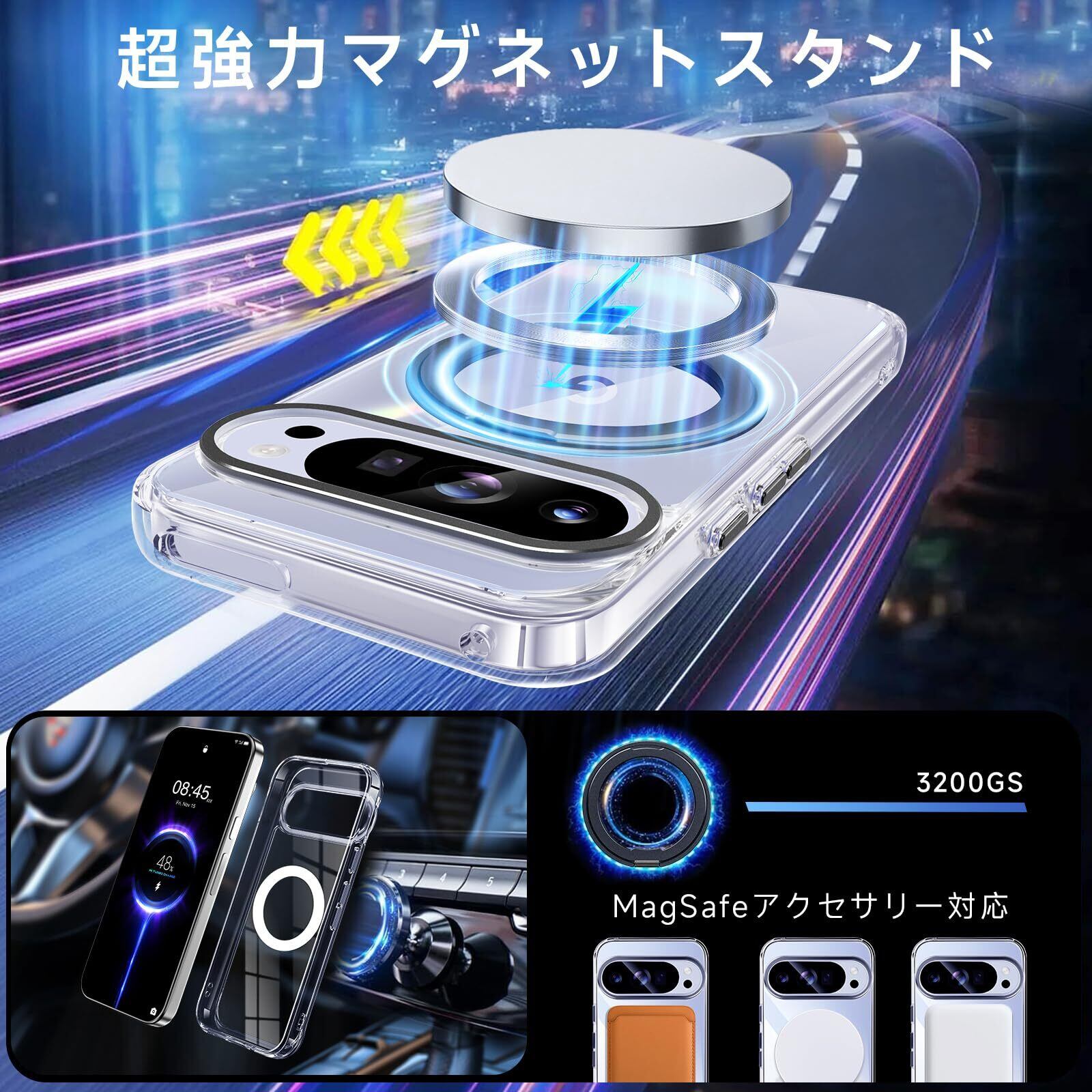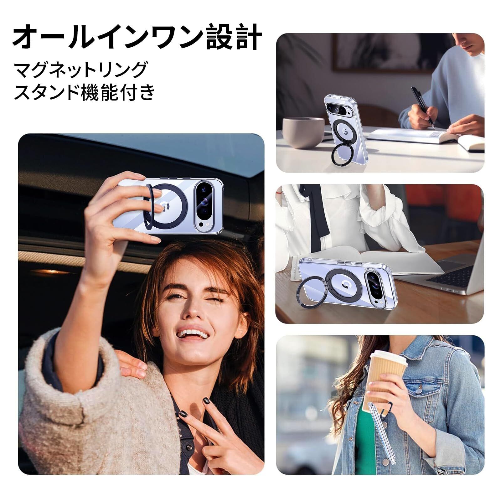 【米軍MIL規格・Magsafe対応】Google Pixel 9 / 9 Pro 用 ケース MagSafe対応 リング 360°回転スタンド機能 縦横両対応 透明 黄ばみ防止 ワイヤレス充電 レンズ保護 耐衝撃 携帯カバー グーグルピクセル9/9プロ カバー 6.3 インチ マグネット搭載 車載ホルダー マグセーフ対応 おしゃれ (クリアブラック)