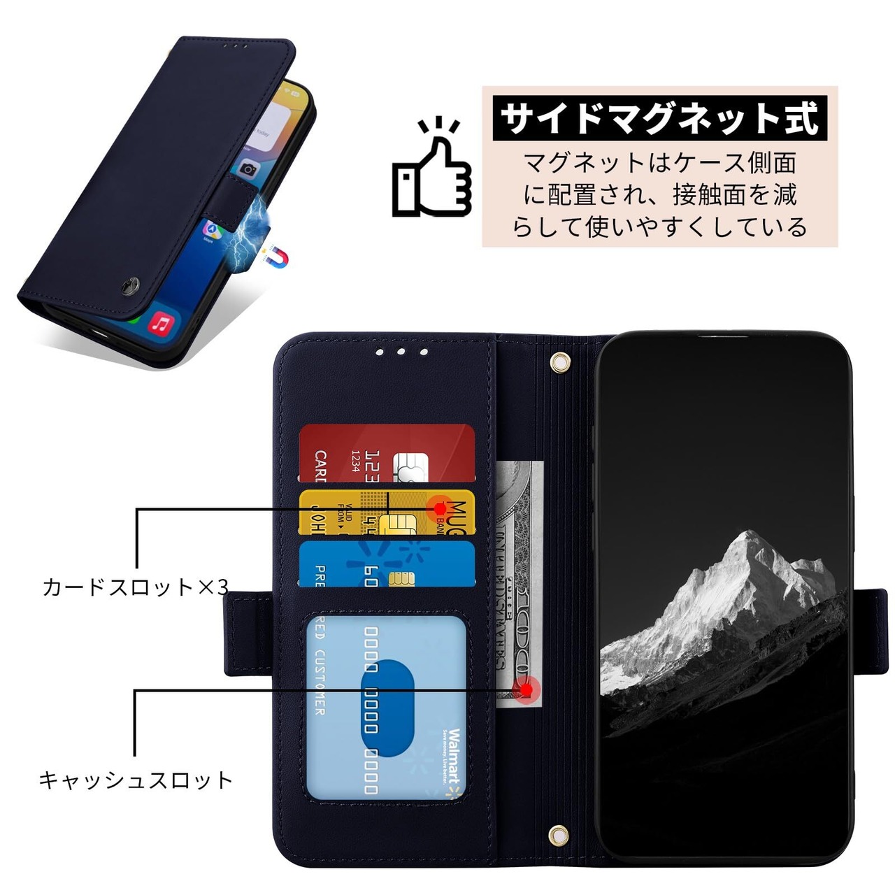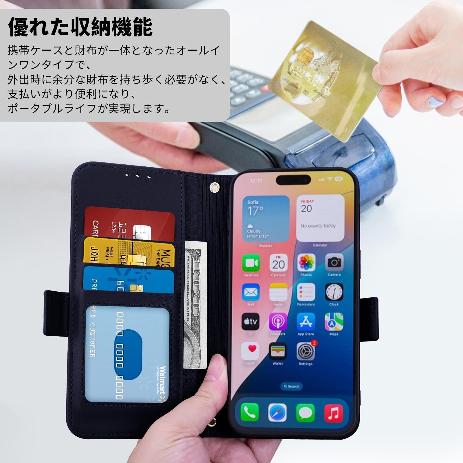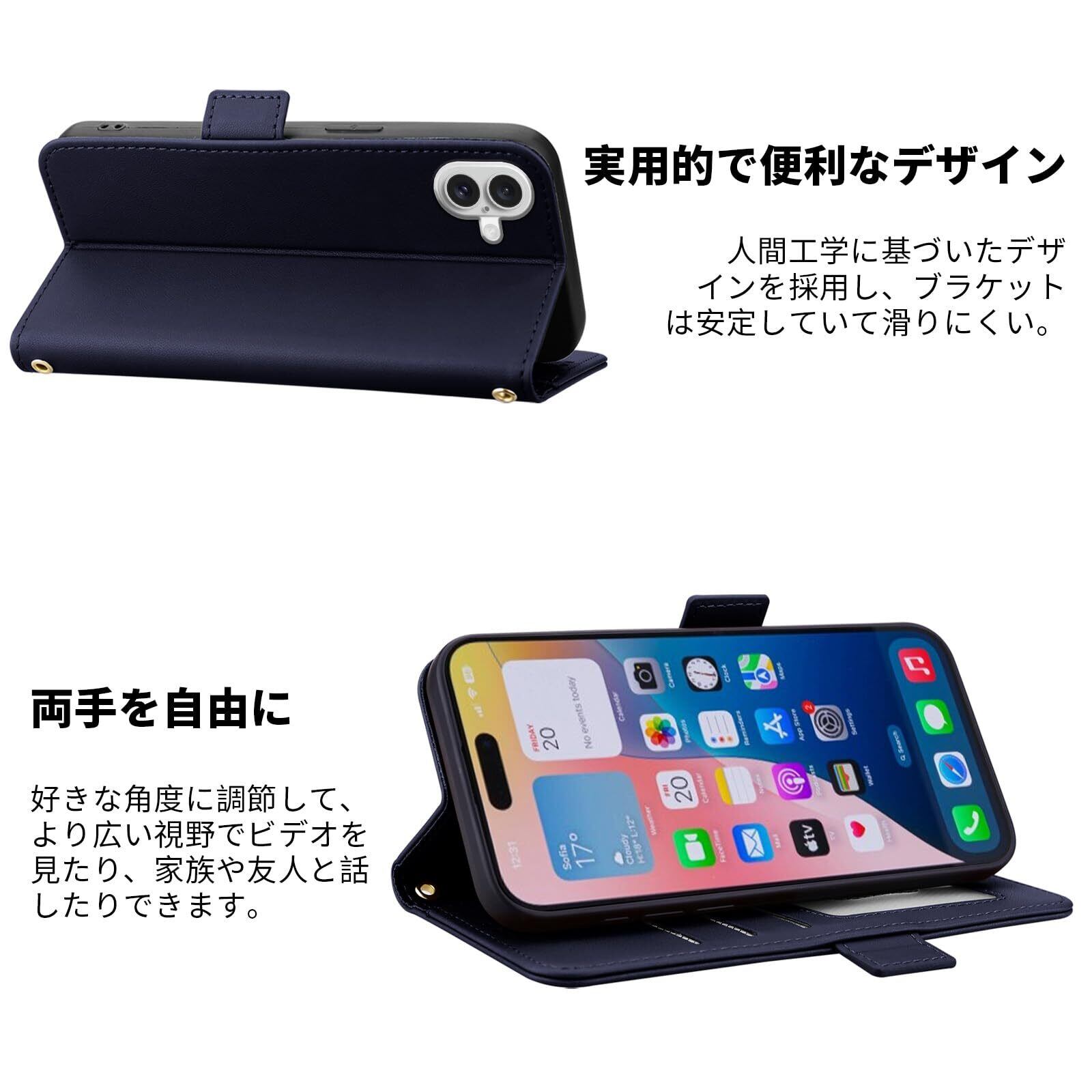 【パワフルなカード&キャッシュ収納】あいふおん16ケース手帳型 フラップの内側に隠しスロット(カード2枚収納)と伸縮性のあるキャッシュストラップを装備。 IDやクレジットカード、折り畳んだ紙幣を財布なしで安全に持ち運べ、ちょっとした用事やミーティングに最適です。