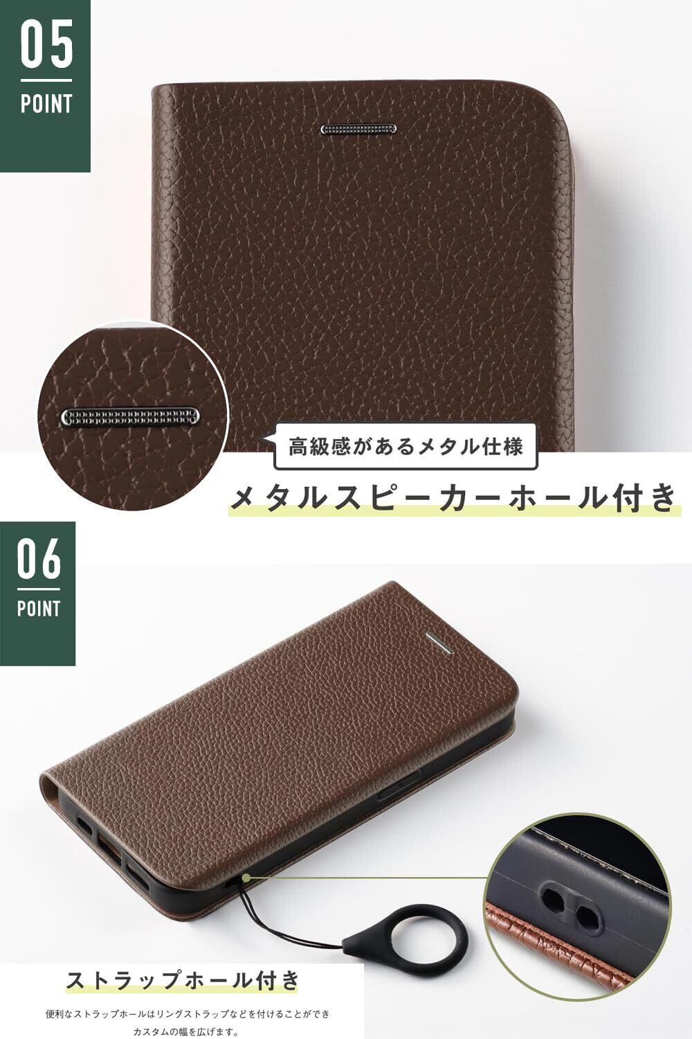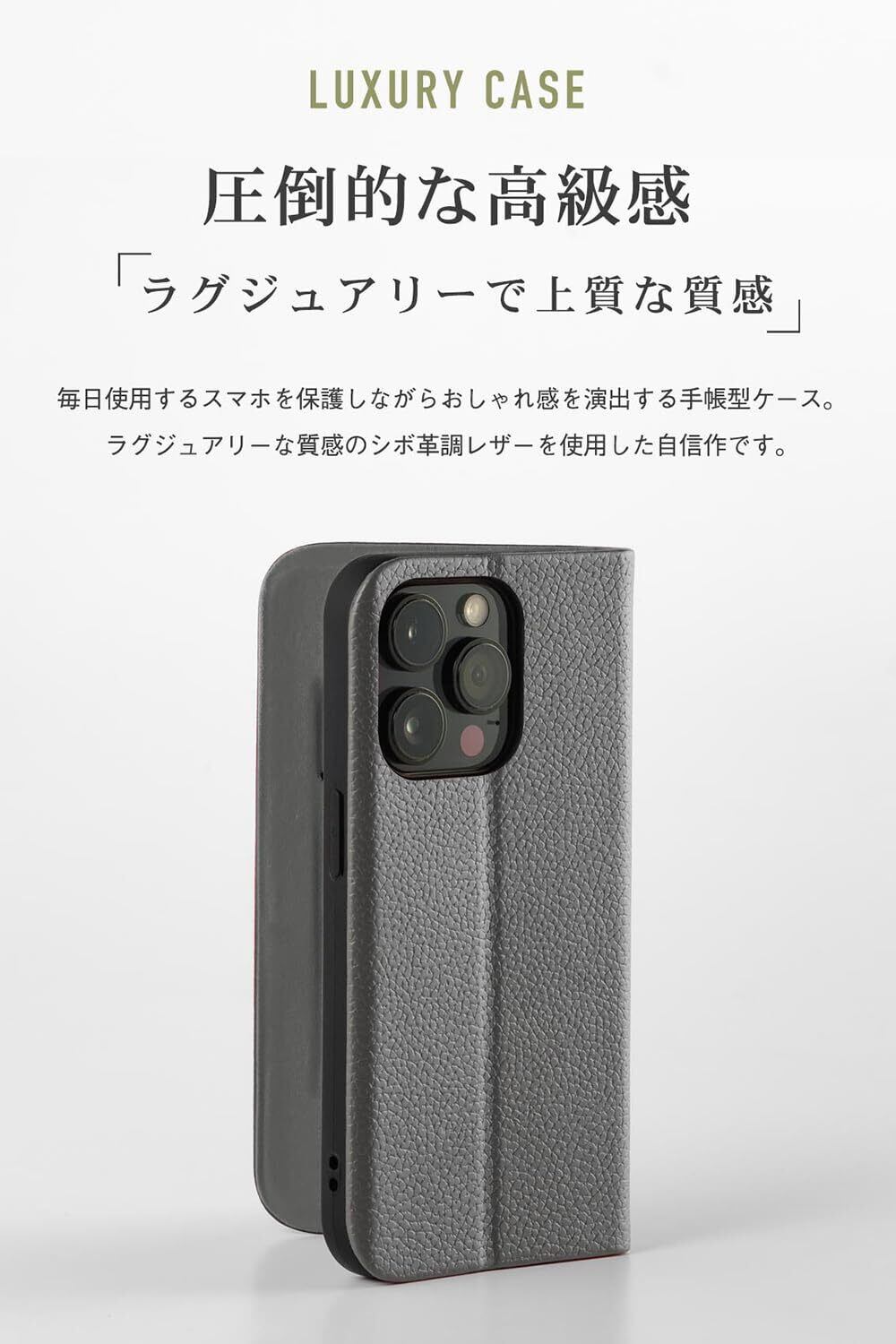 【安心の日本ブランド】【上品で高級感のあるシボ革調PUレザー手帳型ケース】毎日使用するスマホを保護しながらおしゃれ感を演出できるスマホケースです。ラグジュアリーな質感のシボ革調レザーを使用し、上質で満足感の高い仕上がり。手入れしなくても汚れにくく、手触りも良いため扱いやすさ抜群です。