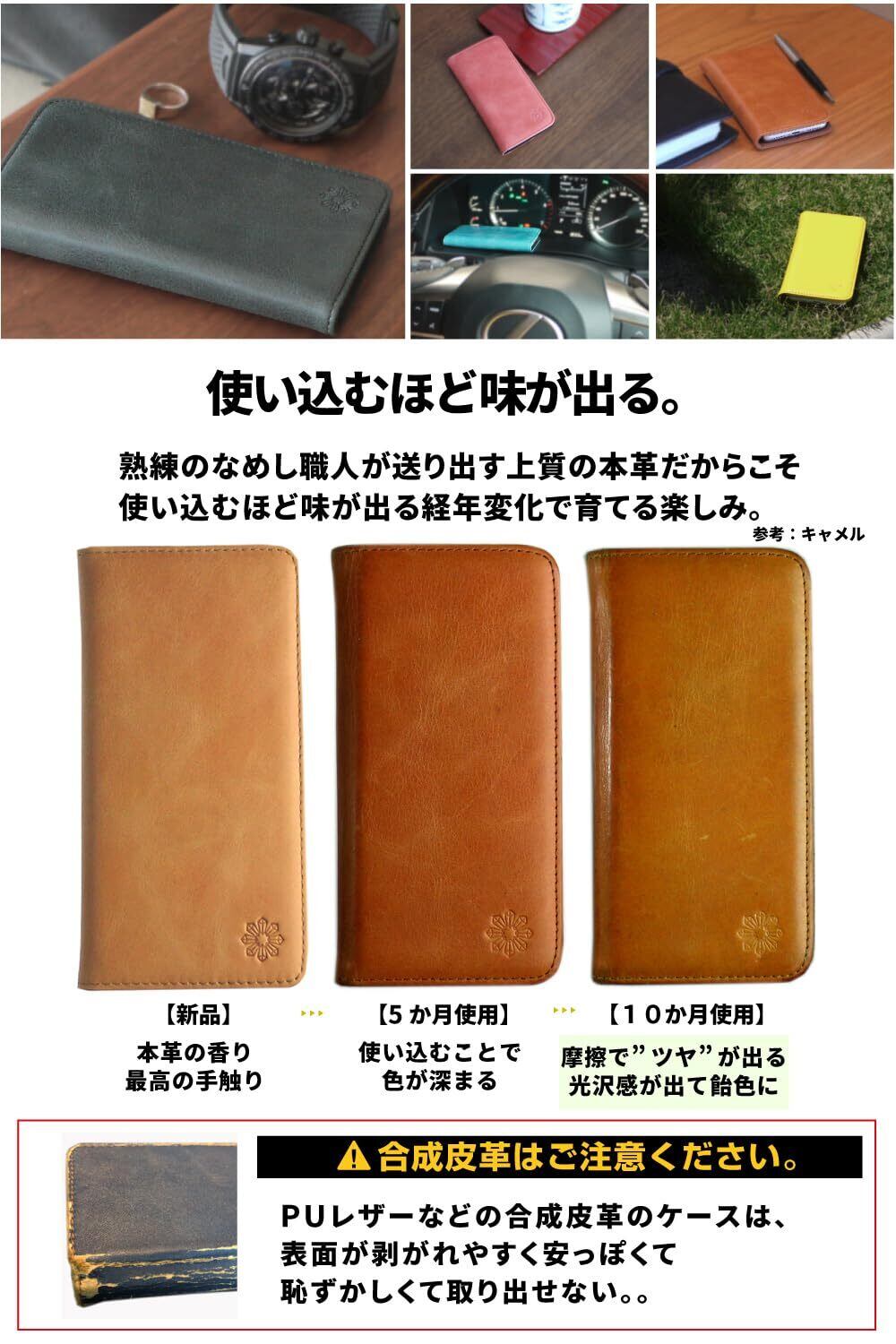 【使い込むことに味が出る】経年変化(エイジング)は、自分だけの風合いがでることが革製品の醍醐味。使い込むごとに世界に1つだけのケースに変化するオンリーワンアイテムです。目立つこと間違いなし!