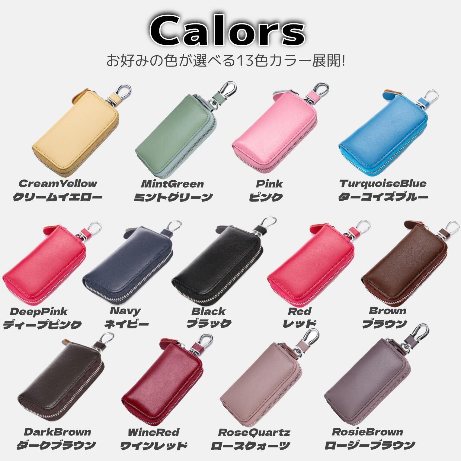 【カラー】PUレザーの質感を生かした13カラーのラインナップです。 Black (ブラック) / Navy (ネイビー) / Red (レッド) / WineRed (ワインレッド) / Brown (ブラウン) / DarkBrown (ダークブラウン) / Pink (ピンク) / DeepPink (ディープピンク) / CreamYellow (クリームイエロー) / MintGreen (ミントグリーン) / TurquoiseBlue (ターコイズブルー) / RoseQuartz(ロースクォーツ) / RosieBrown(ロージーブラウン)【商品詳細】サイズ:11 x 6 x 2.5cm/カードスロット✕2/キーフック✕6/キーチェーン✕1/スマートキースロット✕1