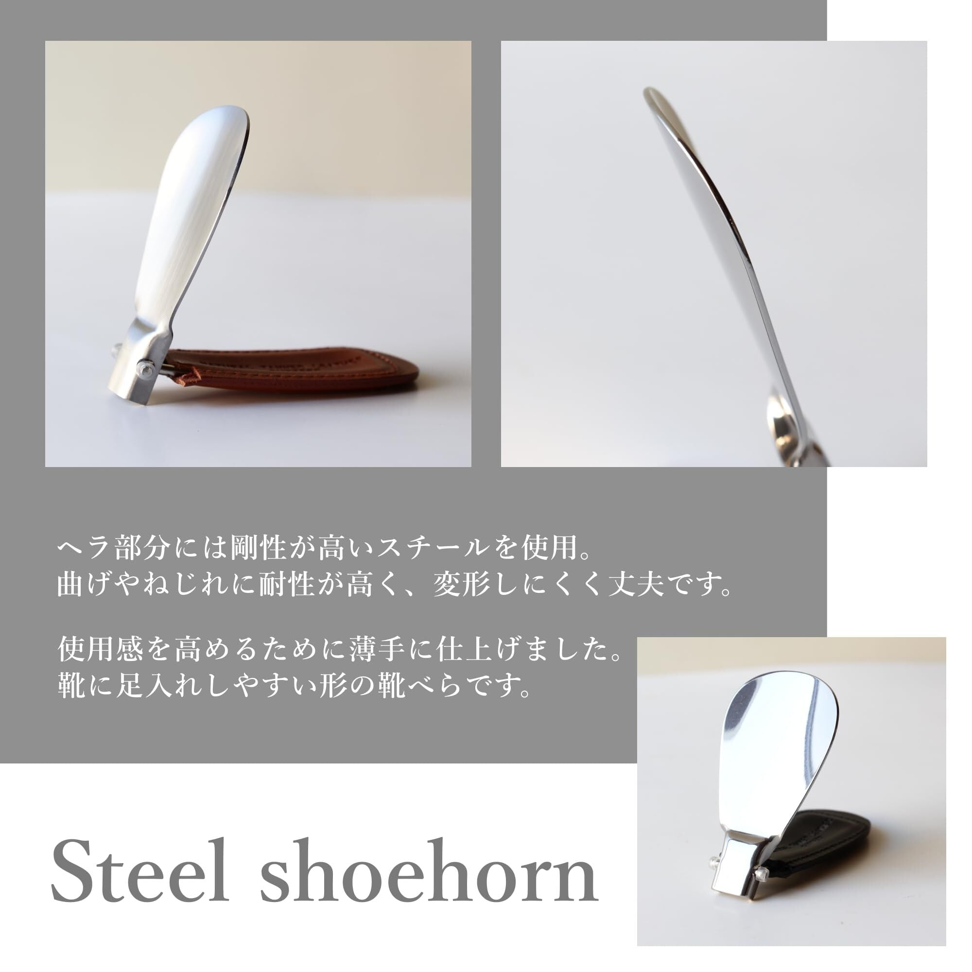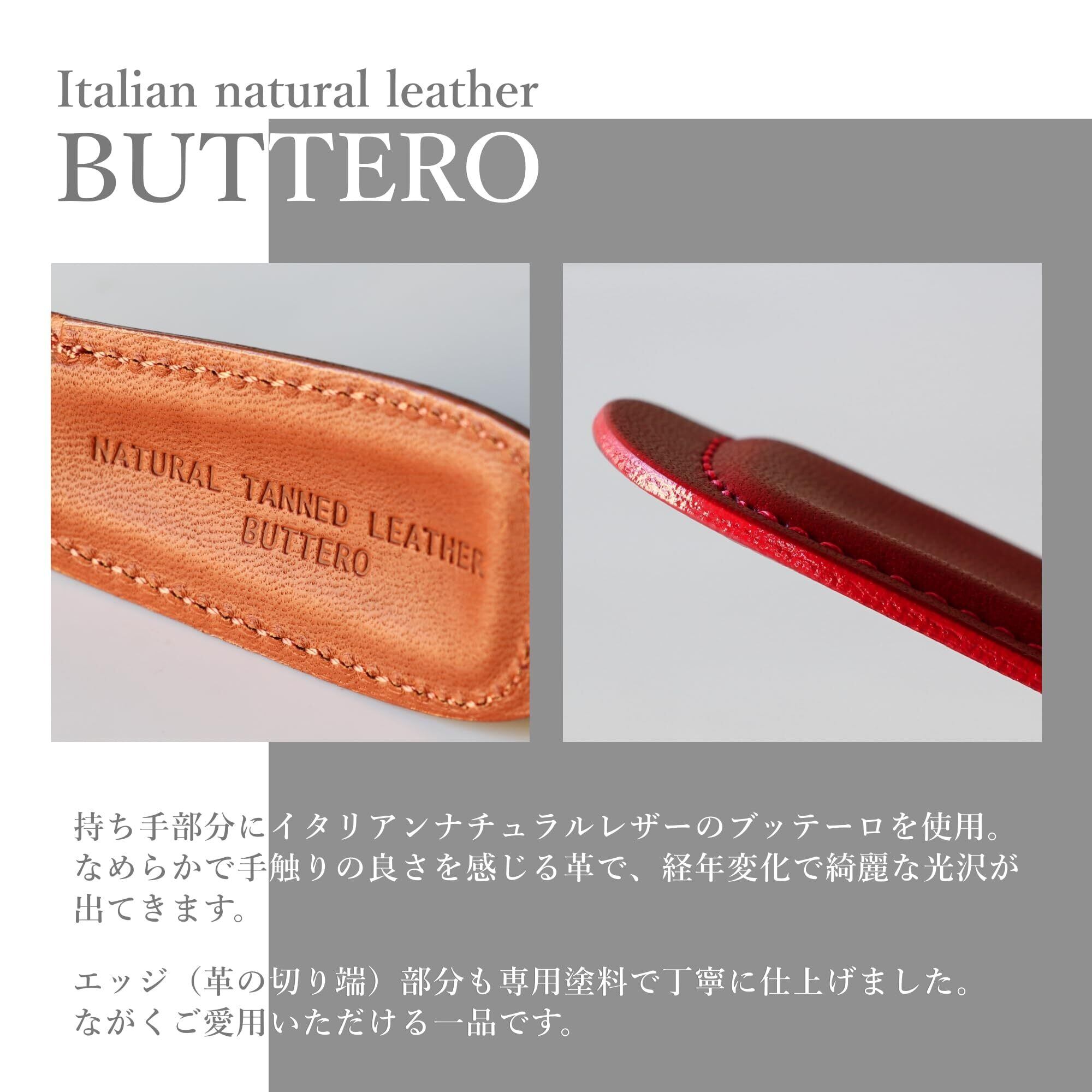 持ち手部分にイタリアンナチュラルレザー「ブッテーロ」使用のシューホーンです。シューホーン本体はドイツ製。