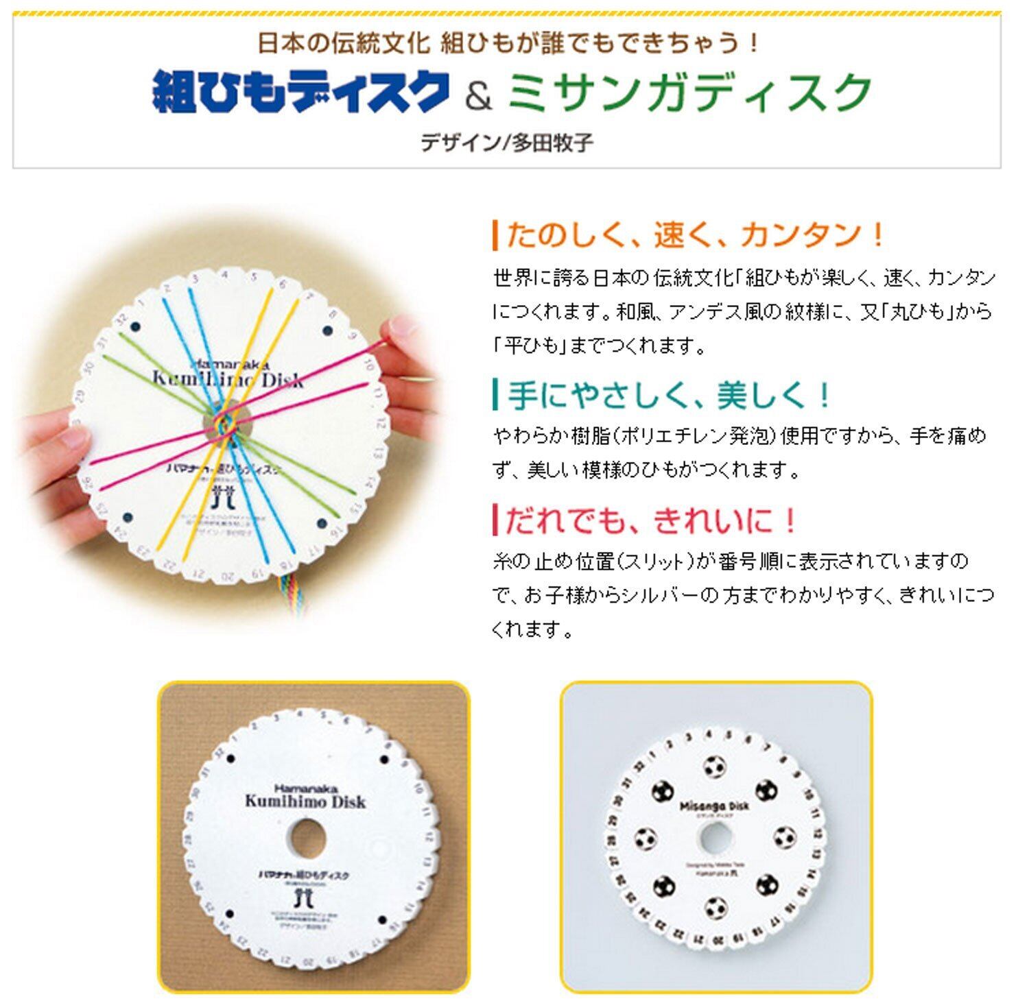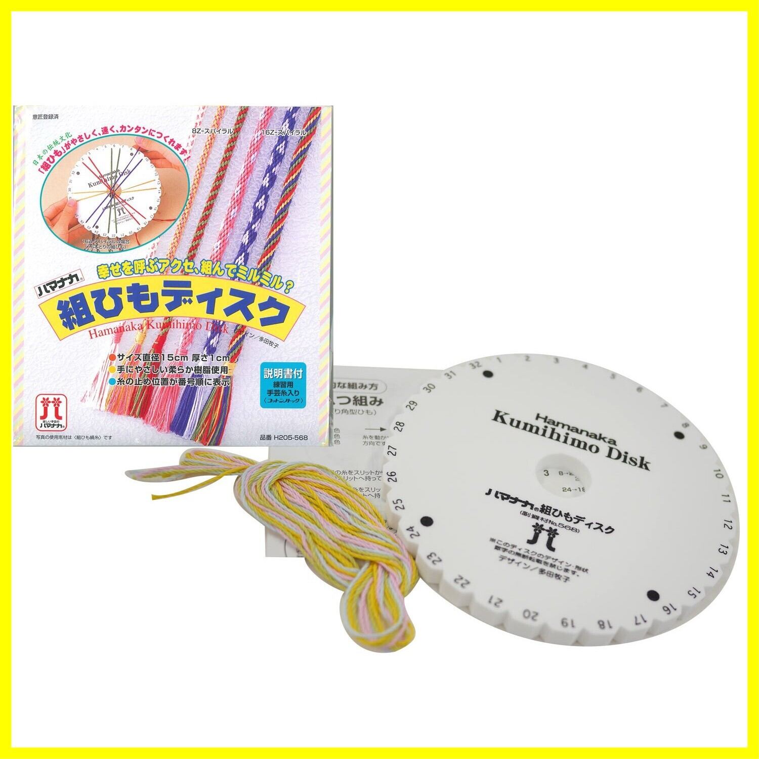 ・セット内容:ディスク本体(直径15cm厚さ1cm)、練習用手芸糸(コットンノック)、説明書