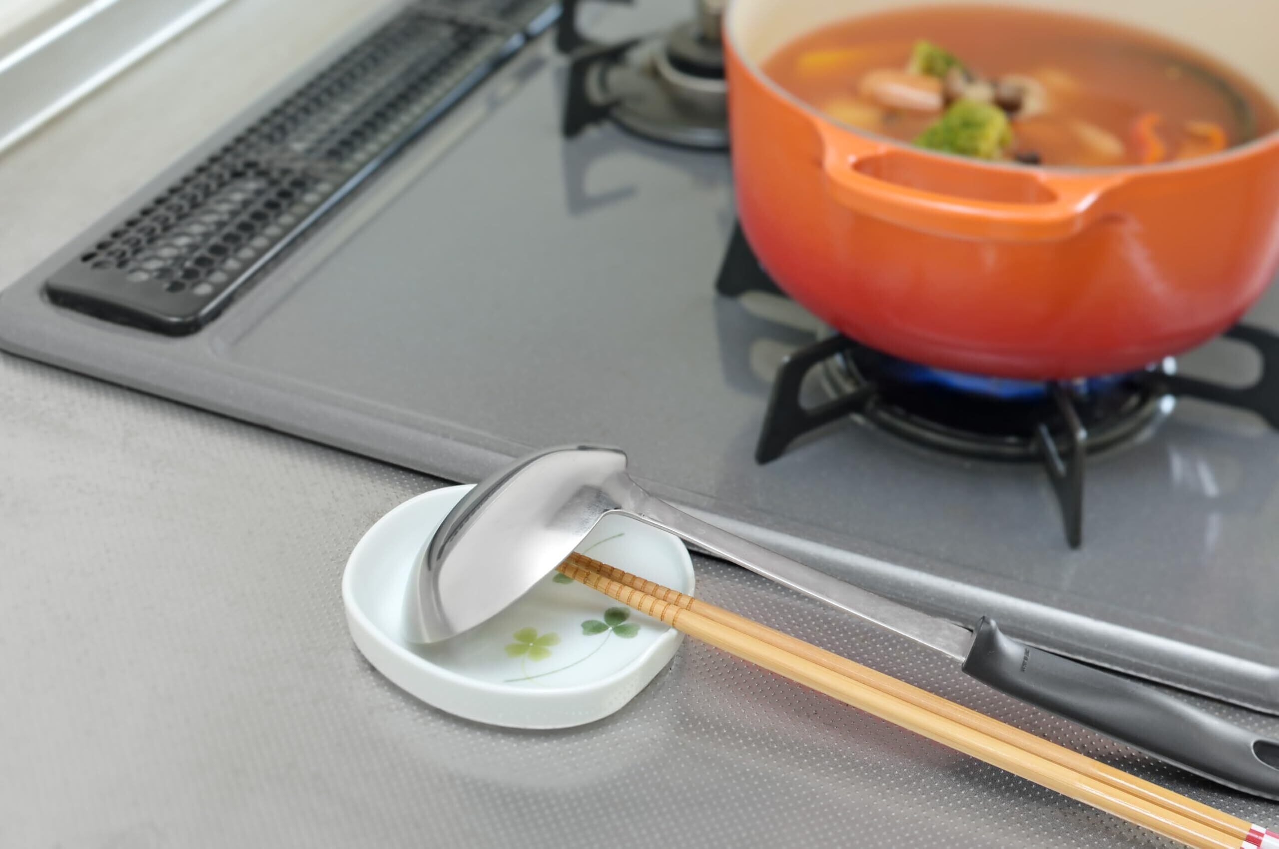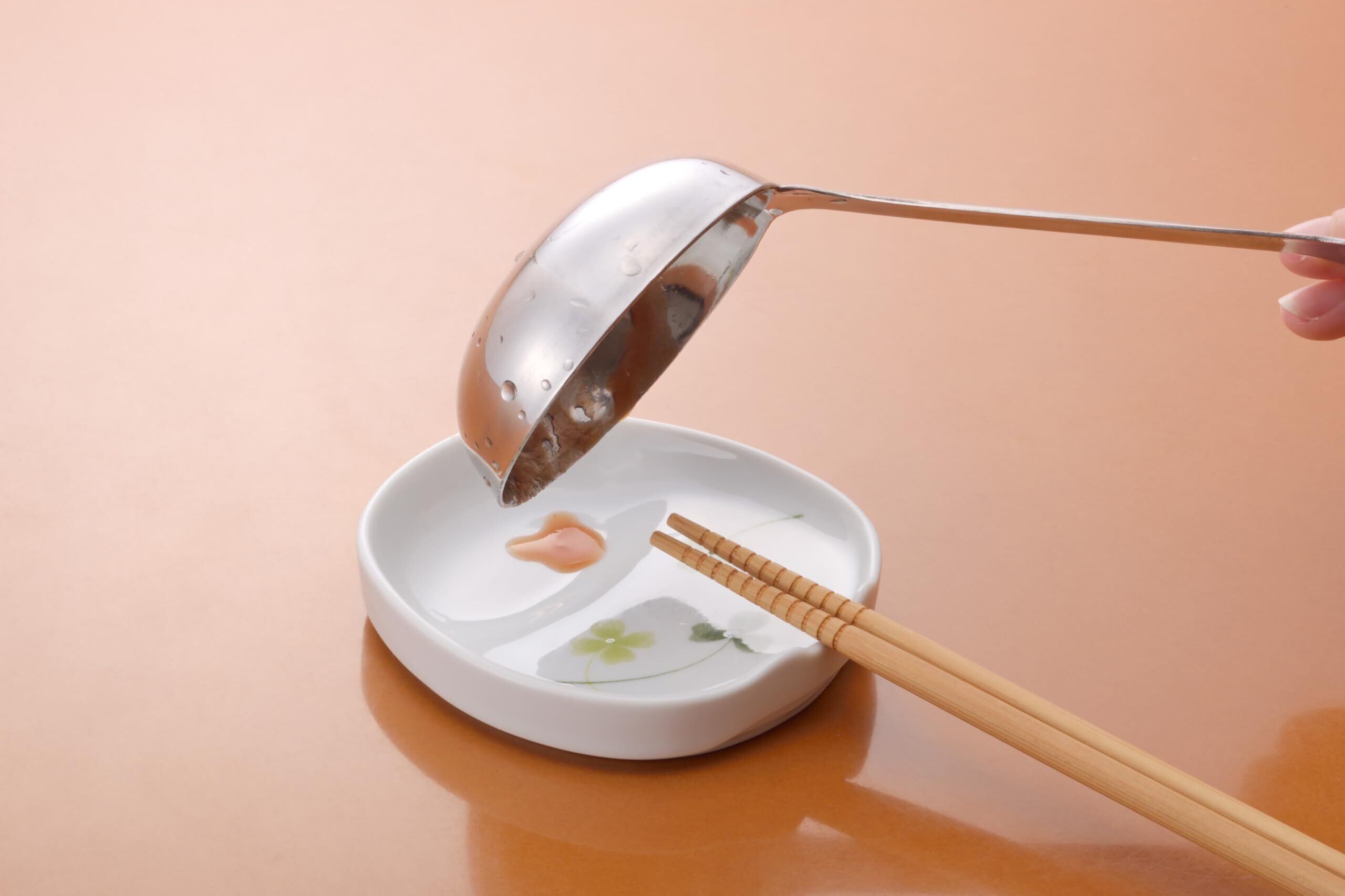調理中のお玉や菜箸置に便利です。器に傾斜が付いておりお玉に残った汁気は隅に溜まる設計になっています。場所を取らないので片付けも簡単。