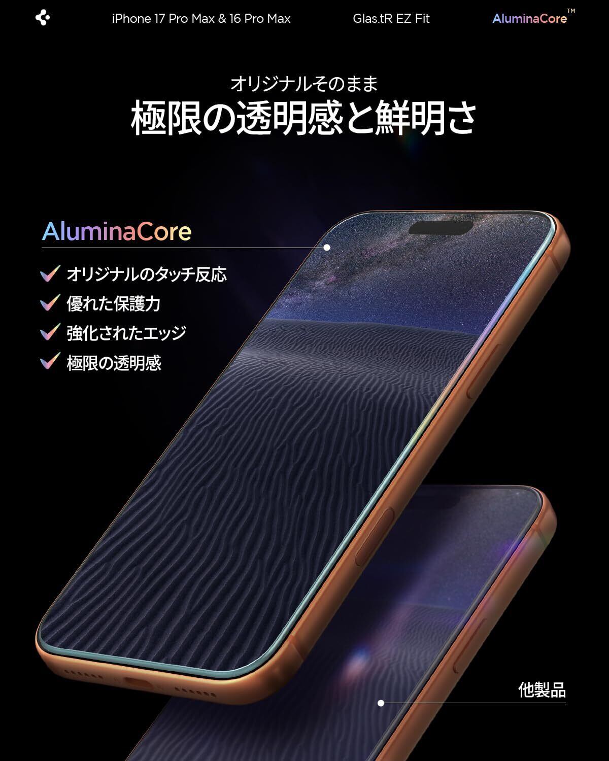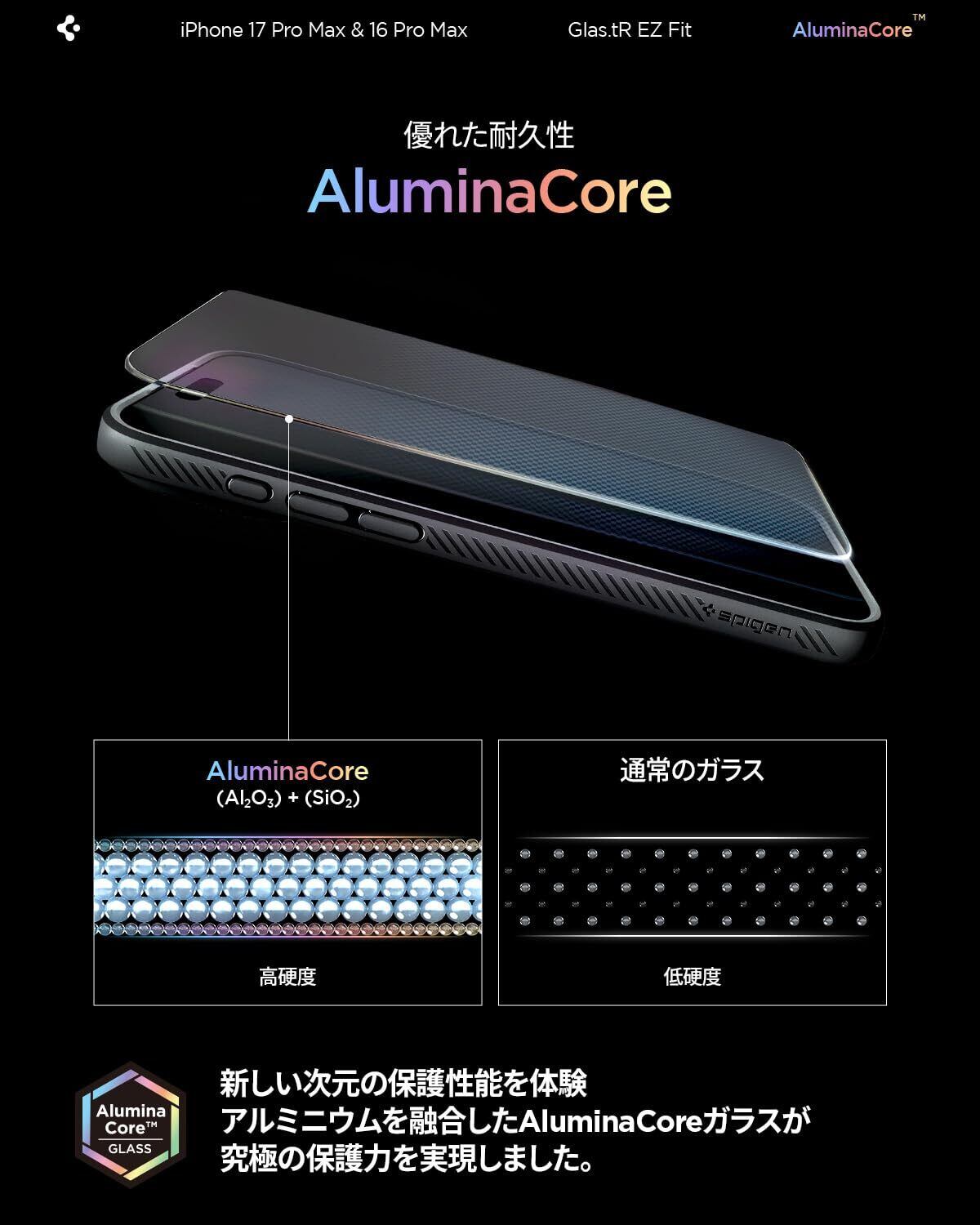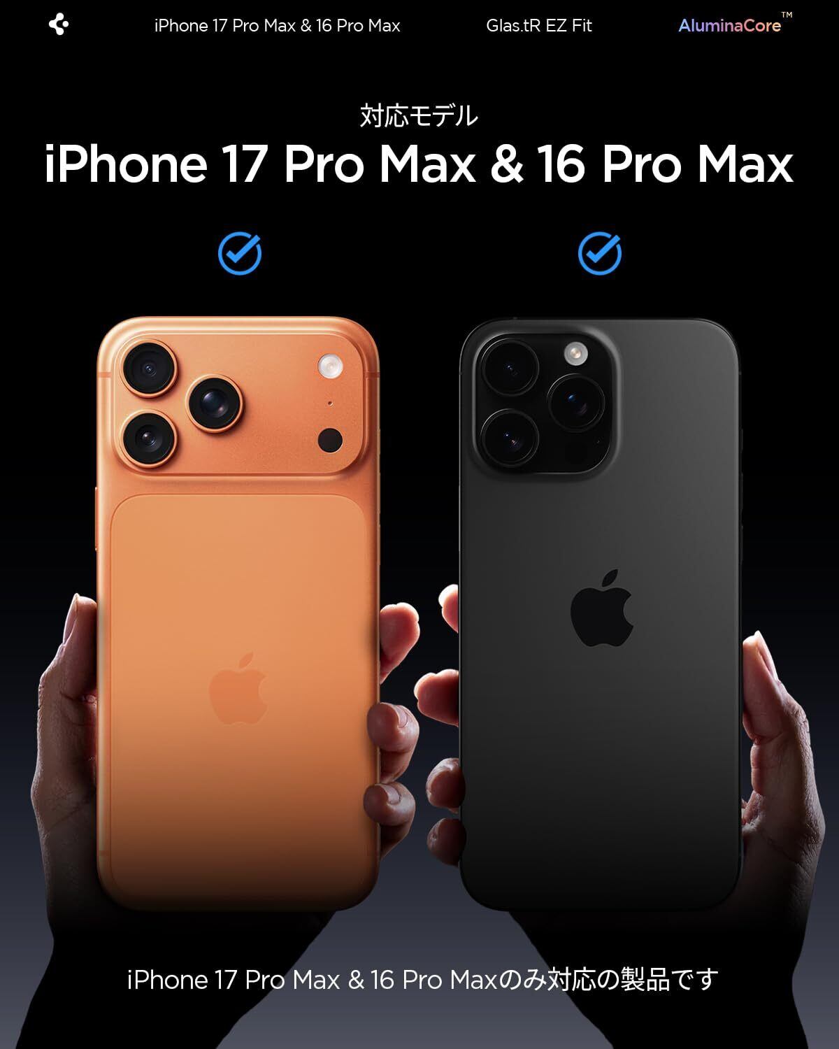 Spigen iPhone 17 Pro Max ガラスフィルム iPhone 16 Pro Max対応 9H+硬度強化ガラス 米軍規格落試験済み アルミナコア 貼り付けトレイ付き ナノコーティング 飛散防止 2枚入 EZ Fit AGL07907