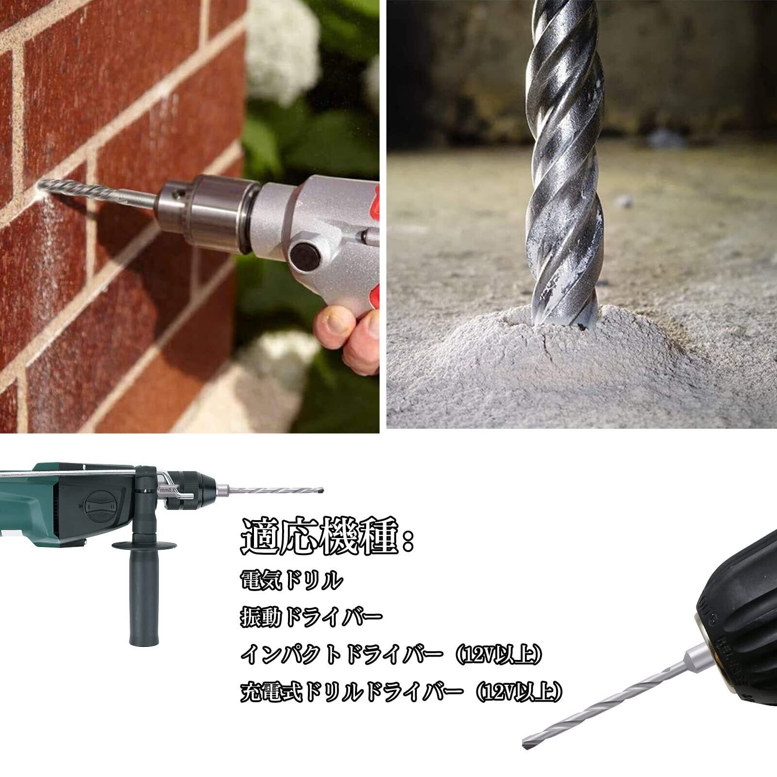 【適応機種】汎用六角軸(6.35mm)仕上げでインパクトドライバーにワンタッチで装着でき、コンクリート用ドリルとして手軽にご使用いただけます。対応工具:●電気ドリル●インパクトドライバー(12V以上)●充電式ドリルドライバー(12V以上)●振動ドライバー
