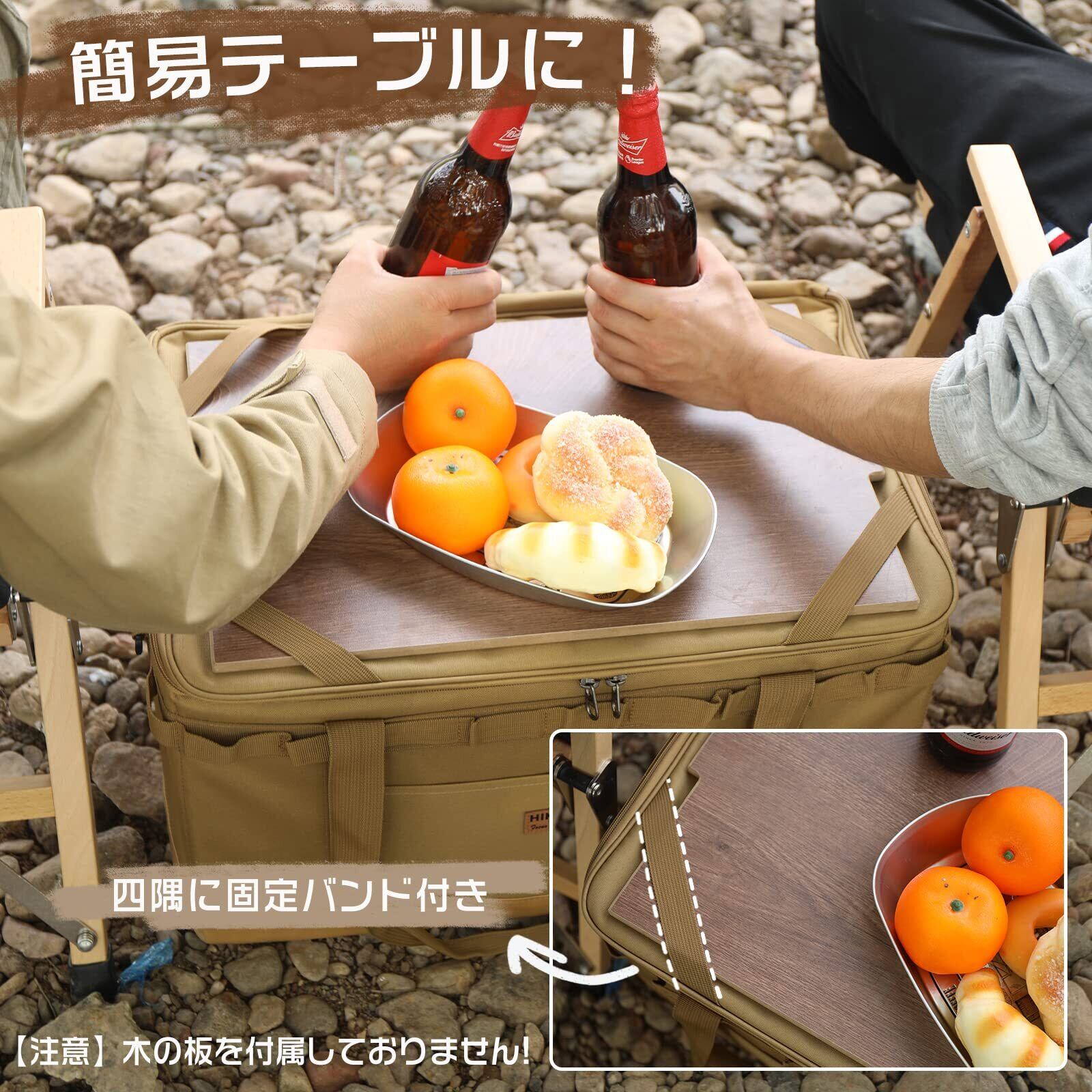 自立式:キャンプバッグの全四方に固いプラダン素材が埋め込まれているので、バック自体に剛性があり自立する、上に荷物の積み重ねもオッケーです、ドリンクや小物を置くサブテーブルとしても使用可能、しっかりした素材なので崩れることがないです
