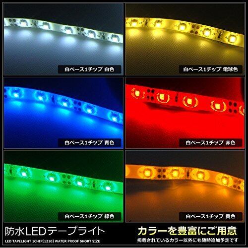 【製品仕様】入力電圧:DC12V/消費電流の目安:1mあたり約0.3A(ロットや色により異なります)/SMDタイプ:1210/SMD個数:5cmごとに3個/防水性能:表面防水処理(水中や大量の水がかかる環境は非対応)/テープライト幅:約8mm/テープライト厚み:約3mm/ケーブルの長さ:約12cm/極性:赤線(プラス)黒線(マイナス)