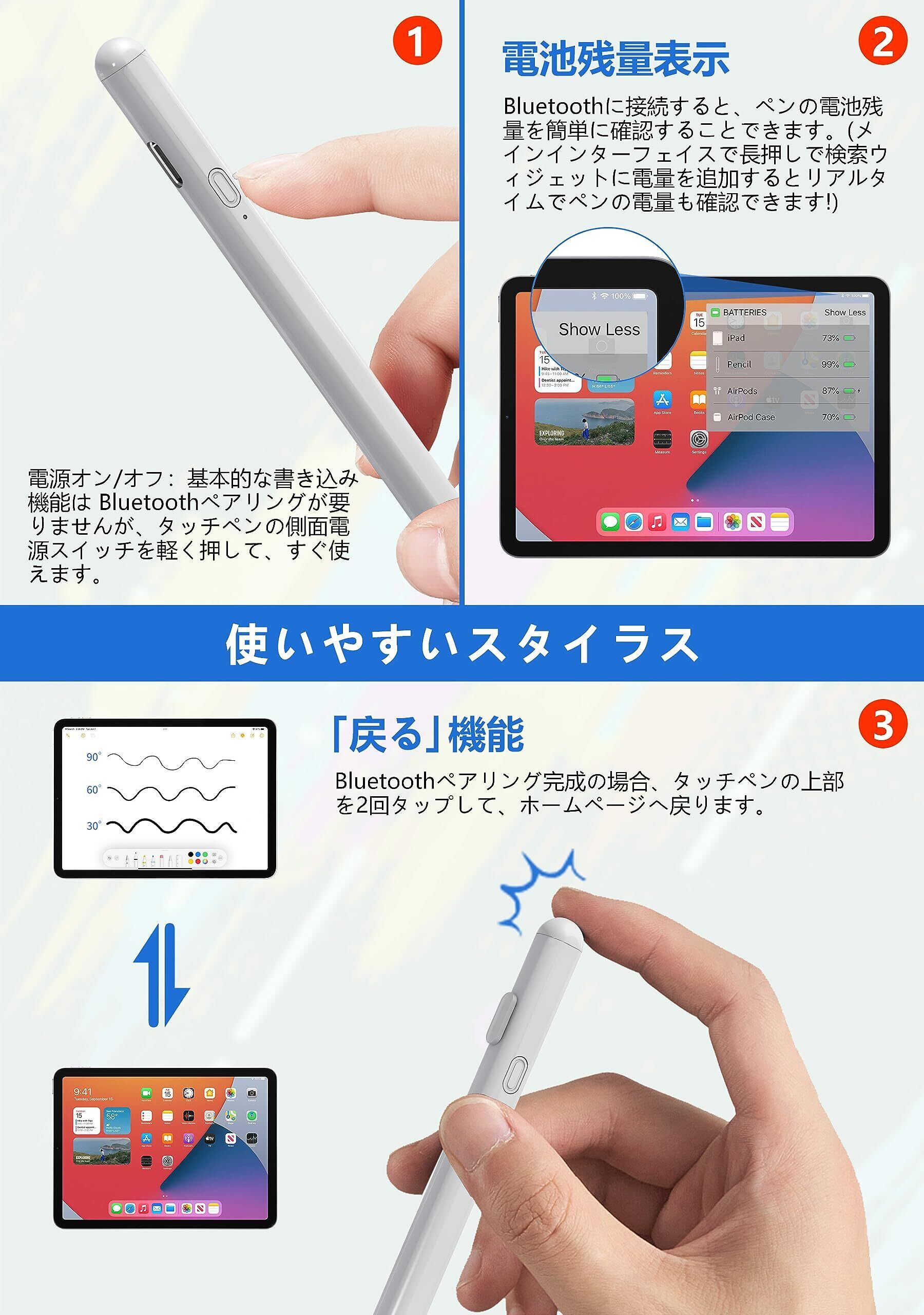【分かりやすい電池残量&「戻る」機能】電源スイッチを1回タップするだけでデバイスとペアリングできます、Bluetoothに接続すると、ペンの電池残量を一目で確認でき、突然の電池切れの恥ずかしさを回避します。Bluetooth に接続した後、ペンキャップの上部をダブルクリックしてホームページに戻ります。