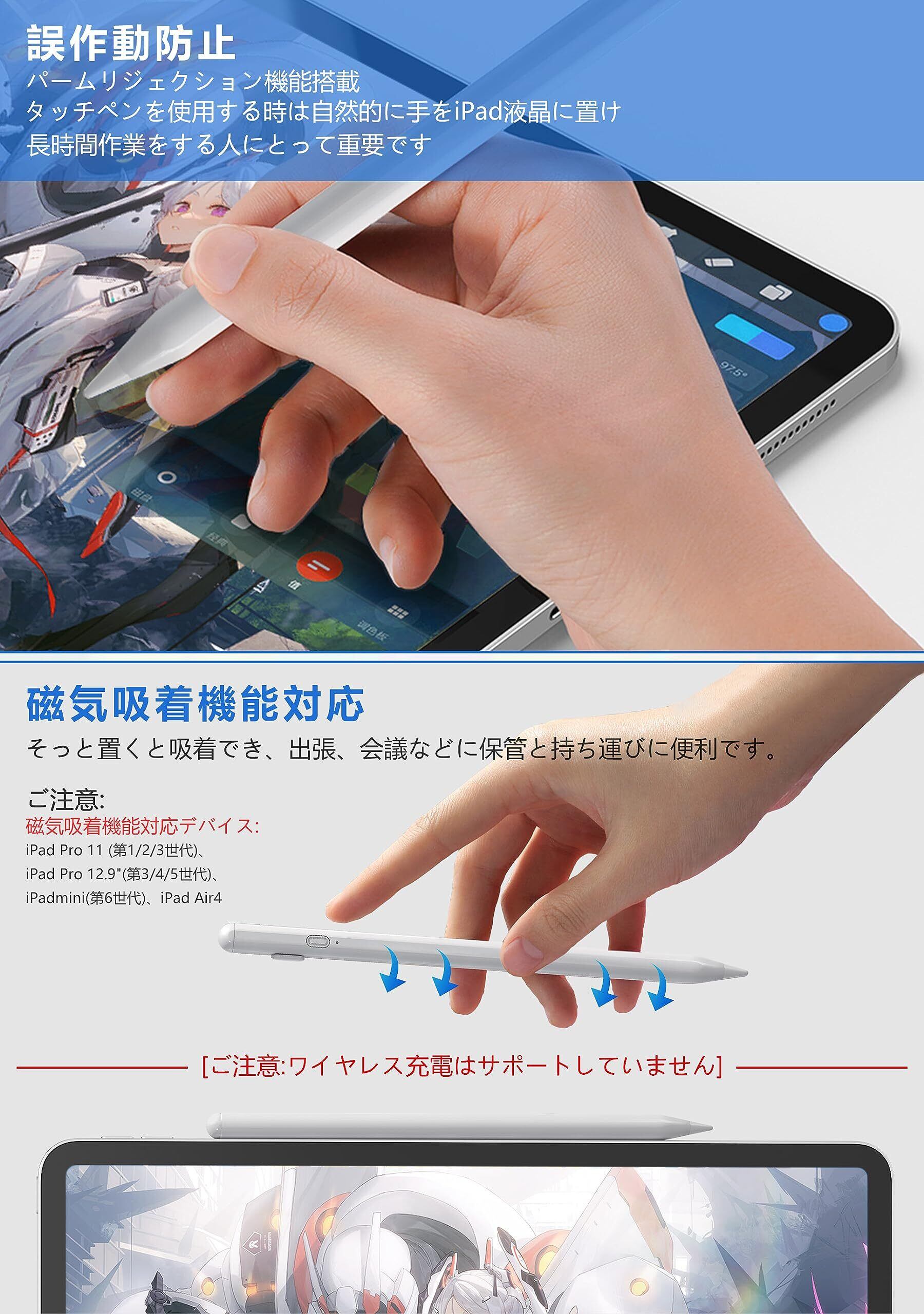 【うっかりタッチ防止&磁気吸着機能】パームリジェクション機能を搭載しており、デバイスの画面に手を置くことができ、より快適で自然な感触を提供します。創作意欲・インスピレーションが妨げられる心配がありません。磁気吸着機能があり、紛失を防ぎ、収納や持ち運びも簡単です。iPad Pro 12.9"、iPad Pro 11"、iPad Air 第4/5世代、iPad mini第6世代など、磁気吸着機能対応デバイスに対応しています。何をする時も驚くほど使いやすく、アイデアが浮かんだ瞬間を逃しません。(注:iPad側面が円弧状のエッジは磁気吸着しにくい可能性があります)