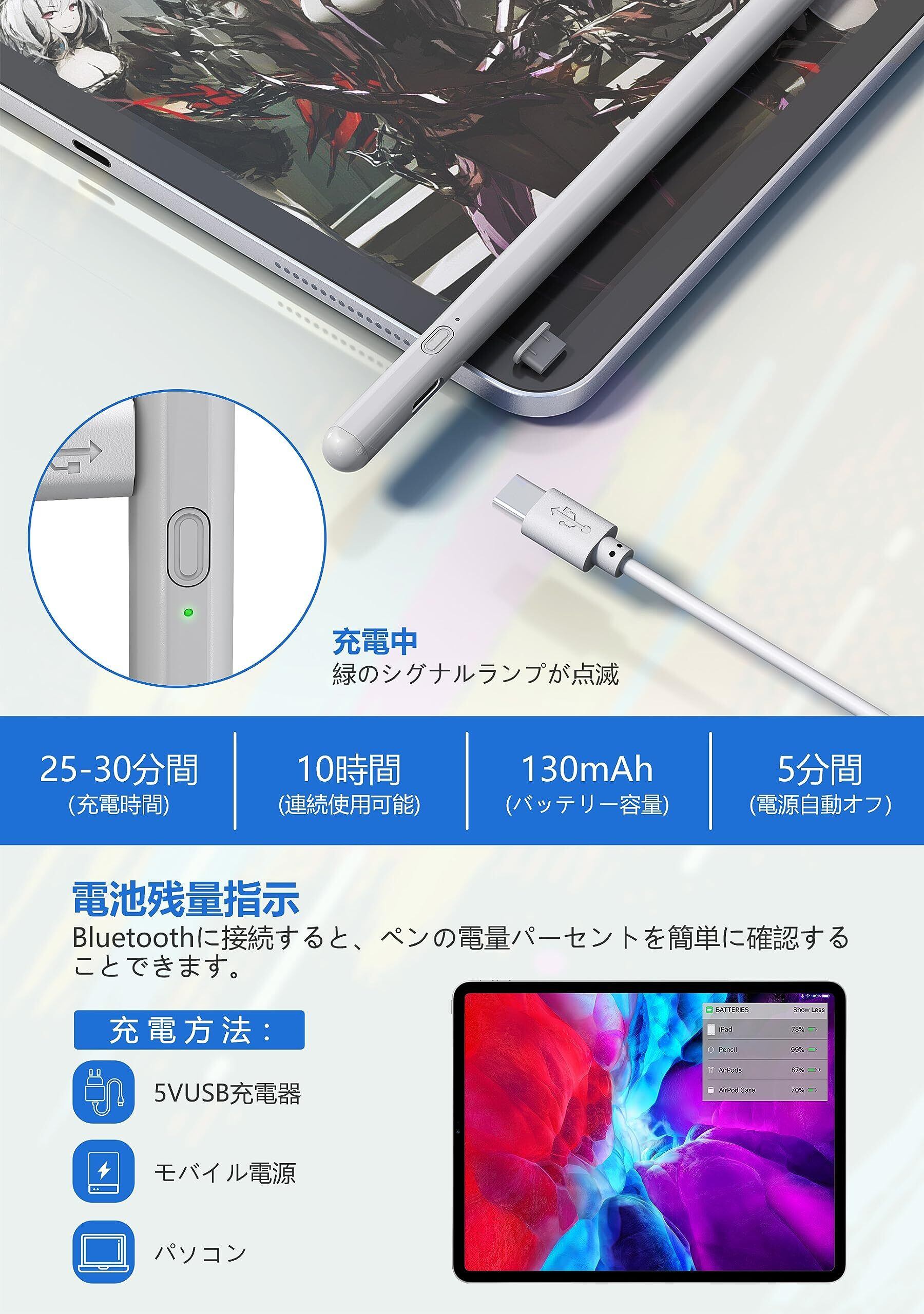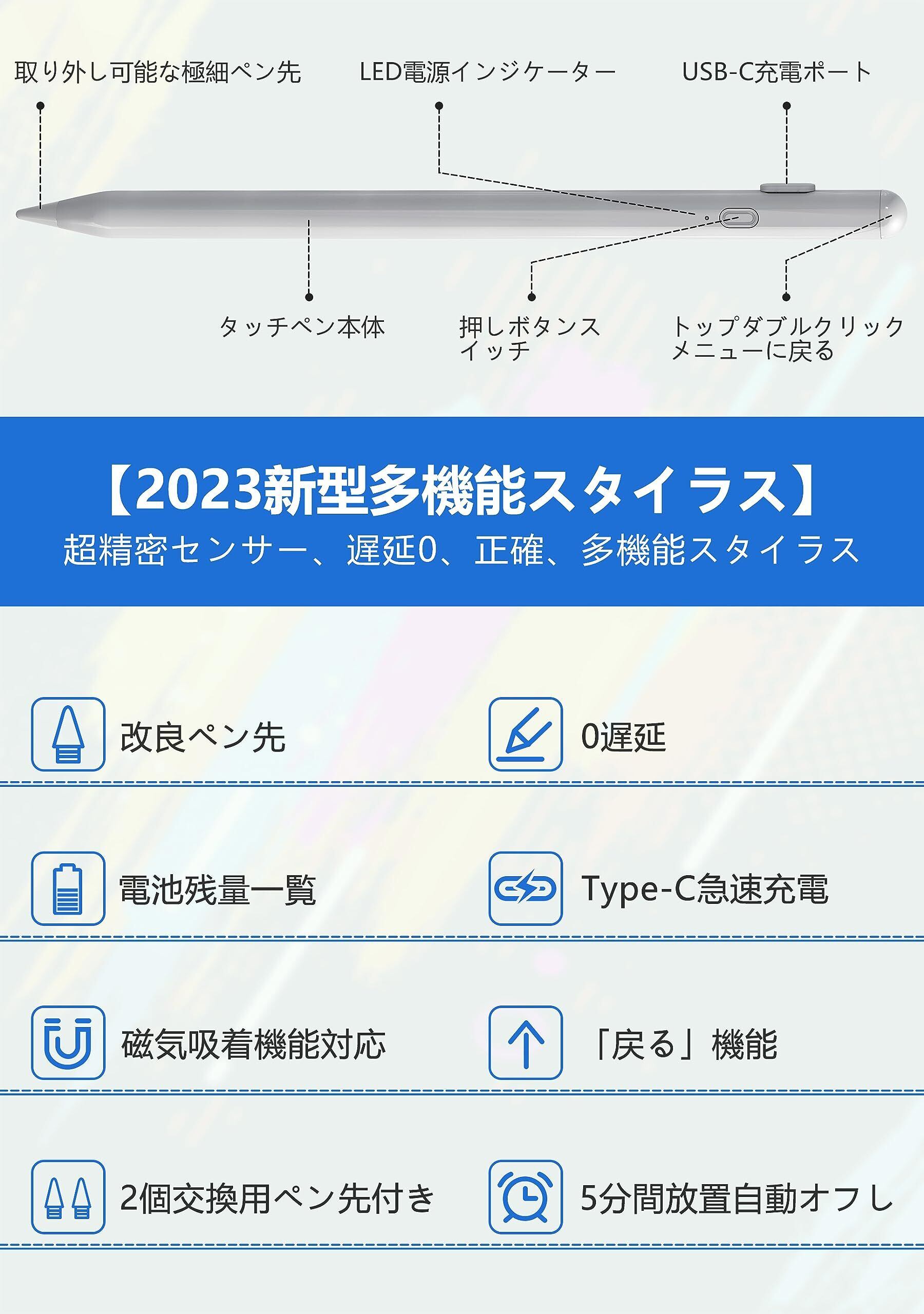 iPad タッチペン 第11世代対応 2025 最新型/傾き感知/磁気吸着機能対応/超高感度/リターンボタン/バッテリー残量表示 iPad ペンシル 誤作動防止機能対応 軽量 耐摩 USB C充電式 apple pencil 2018年~2025年iPad/Pro/air/mini対応 スタイラスペン