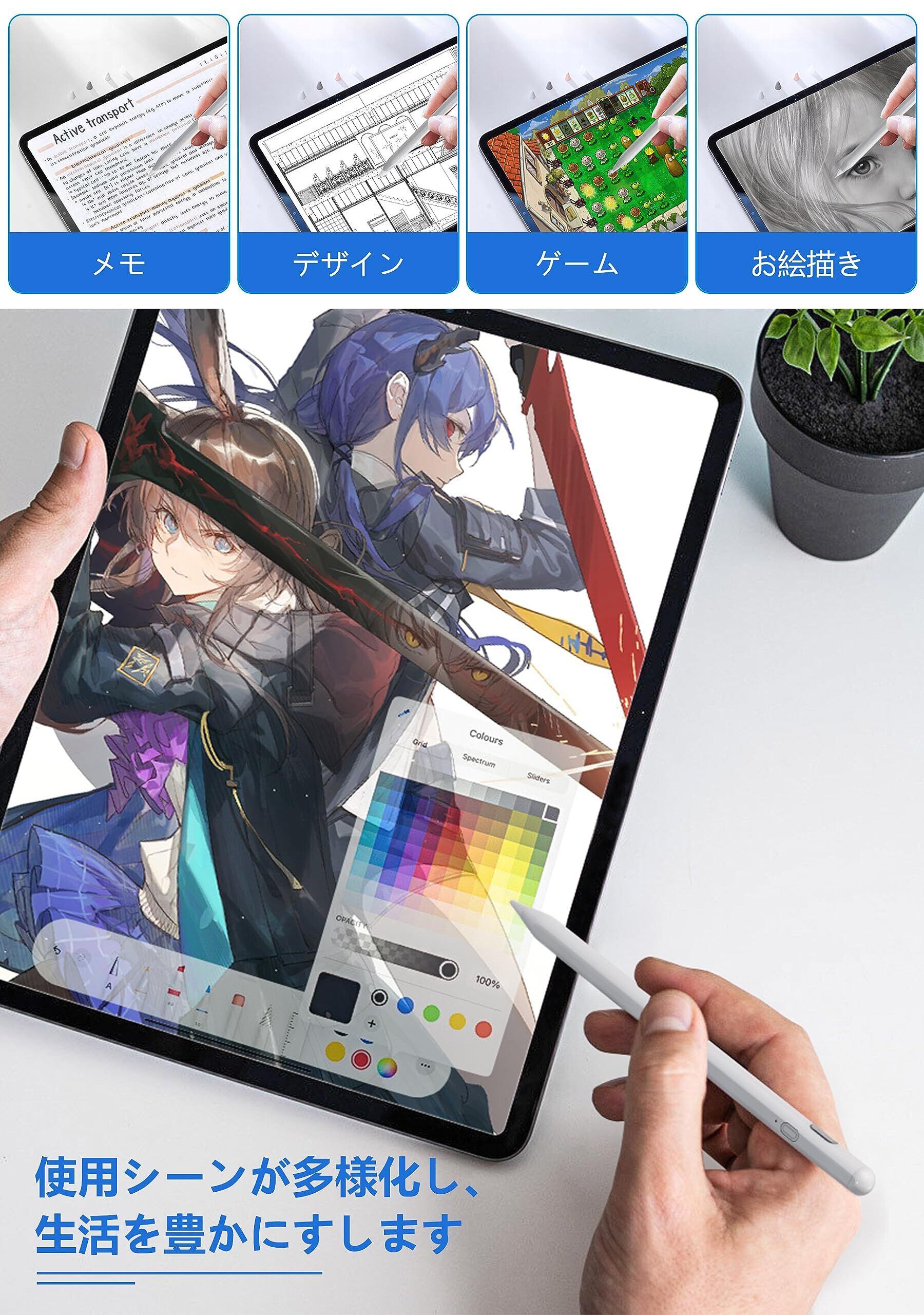 【傾きを感知機能 /超高精度/改良型ペン先】iPadたっちペンは、傾きを感知できるので、ピクセルレベルの精密さを持ちながら、従来の鉛筆のように線の太さを変えるのも、アーティスティックな効果をいろいろ加えるのも思いのままです。絵描き最適!ペン先はApple Pencilと同じ高品質POM素材を使用、Apple pencil(1/2)互換性があり。(ご注意:傾き感知機能対応ソフト:SketchBook、Procreate、Paper、Noteshelf、Artset 。筆圧感知には対応しません。)