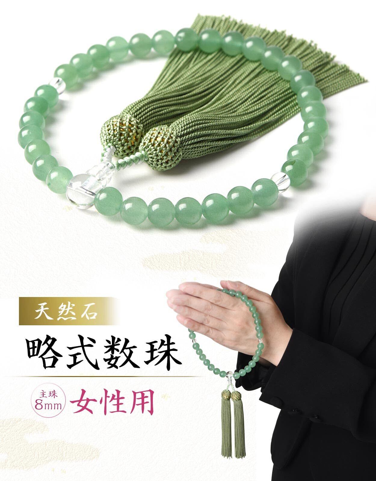 数珠 女性用 頭房 京都職人手作り 葬式 葬儀 数珠袋付き 天然素材 8mm [印度翡翠/本水晶]