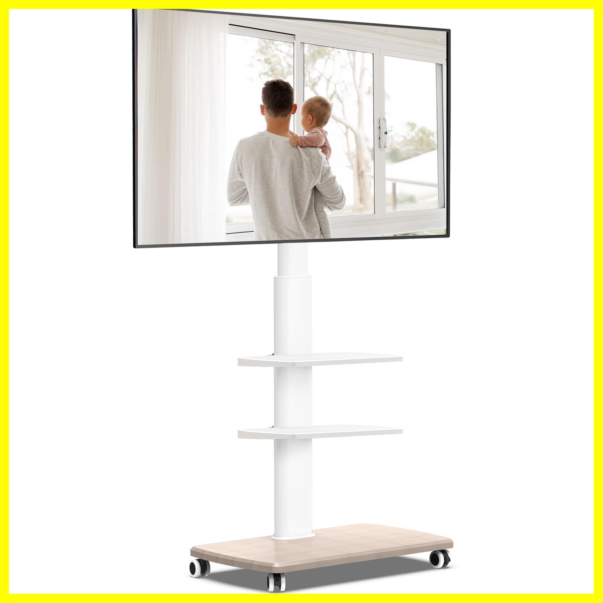 FITUEYES テレビスタンド 32~70型対応 キャスター付き 高さ角度調節可能 移動式 木目調 ホワイト 中段棚二枚付 棚板無階段調節 TT306504WW