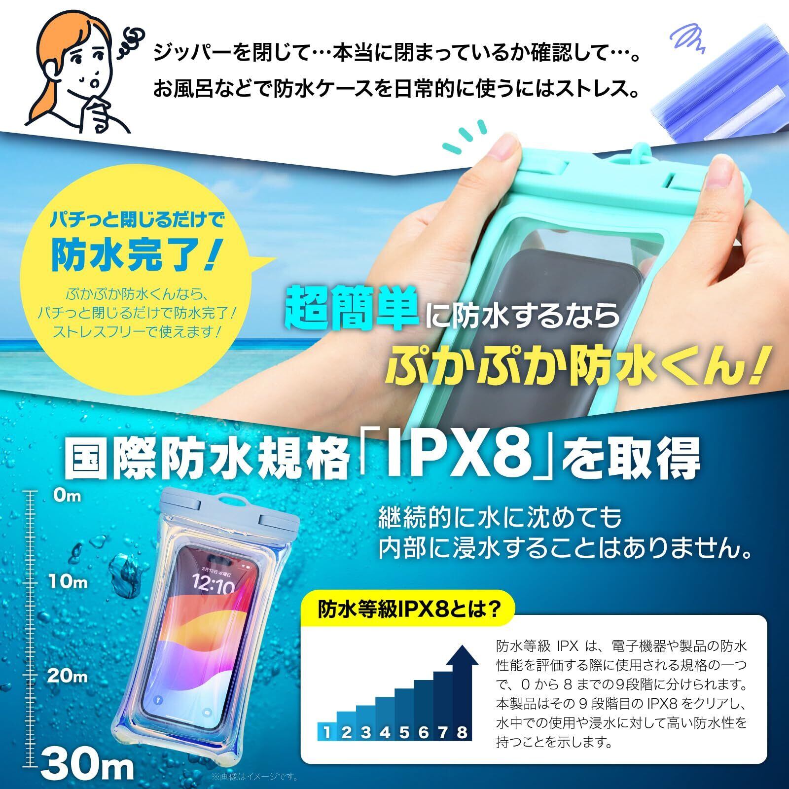 ▶▶▶【ポイント1】国際防水規格「IPX8」を取得。防水等級8段階中のIPX8なので、継続的に水に沈めても内部に侵入することはありません。【ポイント2】水面で浮き輪のように浮く「ぷかぷかエアクッション構造」。紛失防止や落下時の衝撃軽減に役立ちます。【ポイント3】顔認証に対応。ケースに入れたままの操作や撮影も可能です。※指紋認証、水中での操作には対応しておりません。