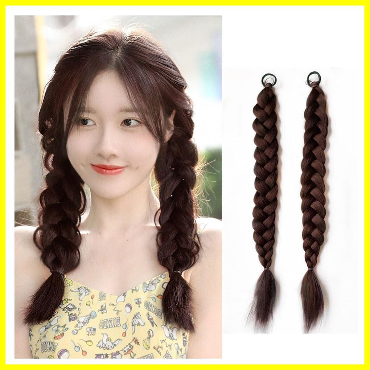 ヘアエクステ 三つ編み ウィッグ 45cm 編み込み ポニーテール ウィッグ ツインテール 編み込み エクステ ダンス エクステンション 付け毛 コスチューム イベント パーティー 誕生日会 キッズ (ダークブラウン)