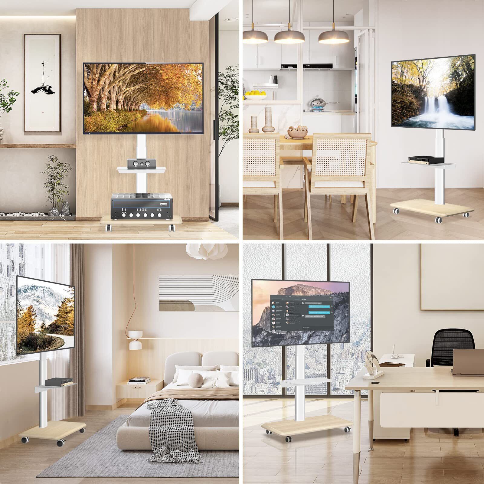 VESA規格対応:VESAはテレビの背面に取り付けたネジ穴間の距離です。キャスター付きテレビスタンドのVESAは100x100 mmから400x400 mmまで対応可能です。大部の27、30、32、37、42、43、47、50、55、60、65インチのテレビ、ディスプレイやモニターなどに適用されます。ご注意:ラック荷重は40kgを超えてはいけません。