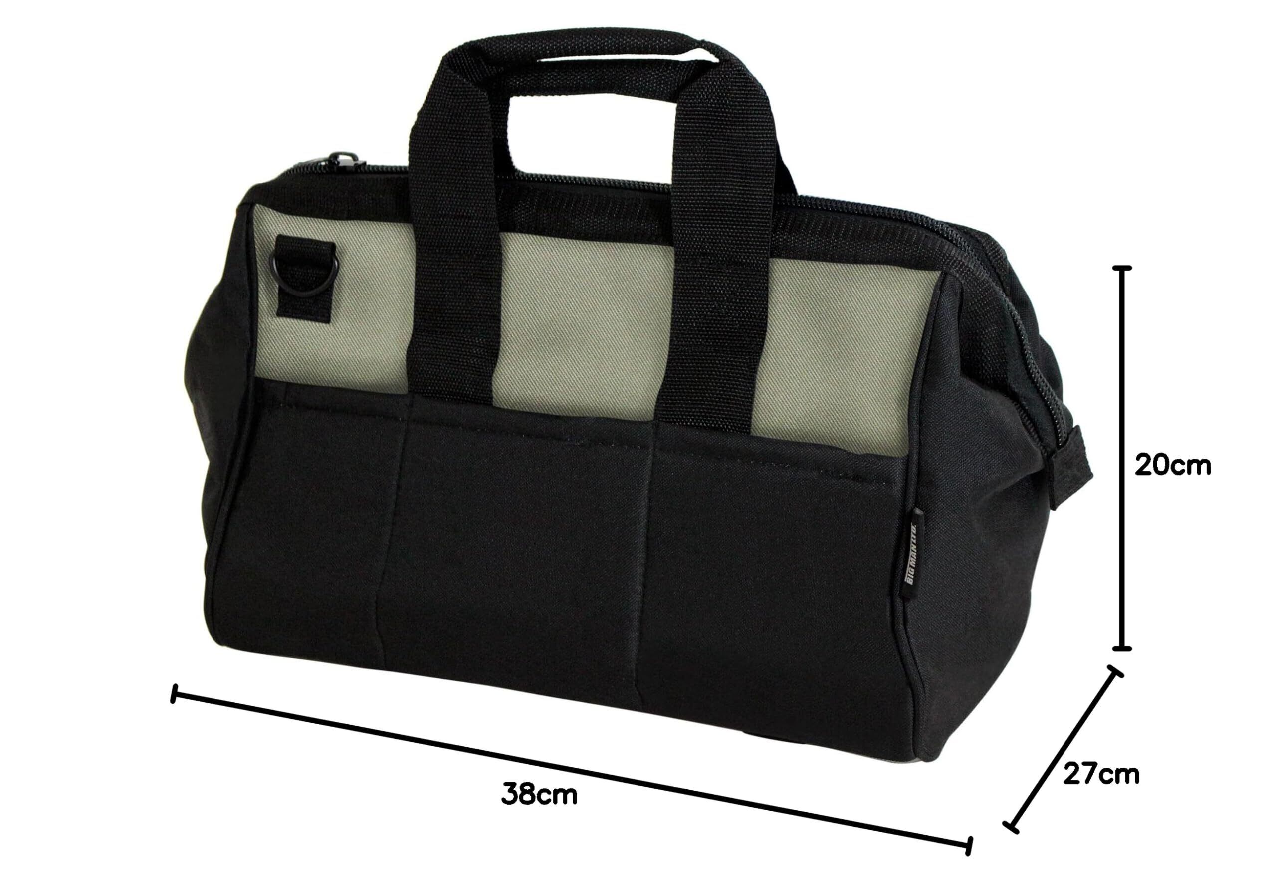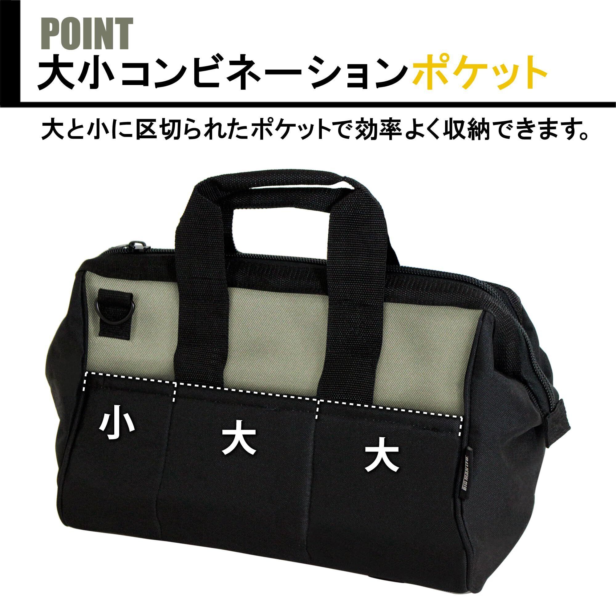 ●出し入れしやすく扱いやすい定番のドクターバッグタイプのツールバッグ。前面ポケットは深型の大小のコンビネーションの3ポケットになっています