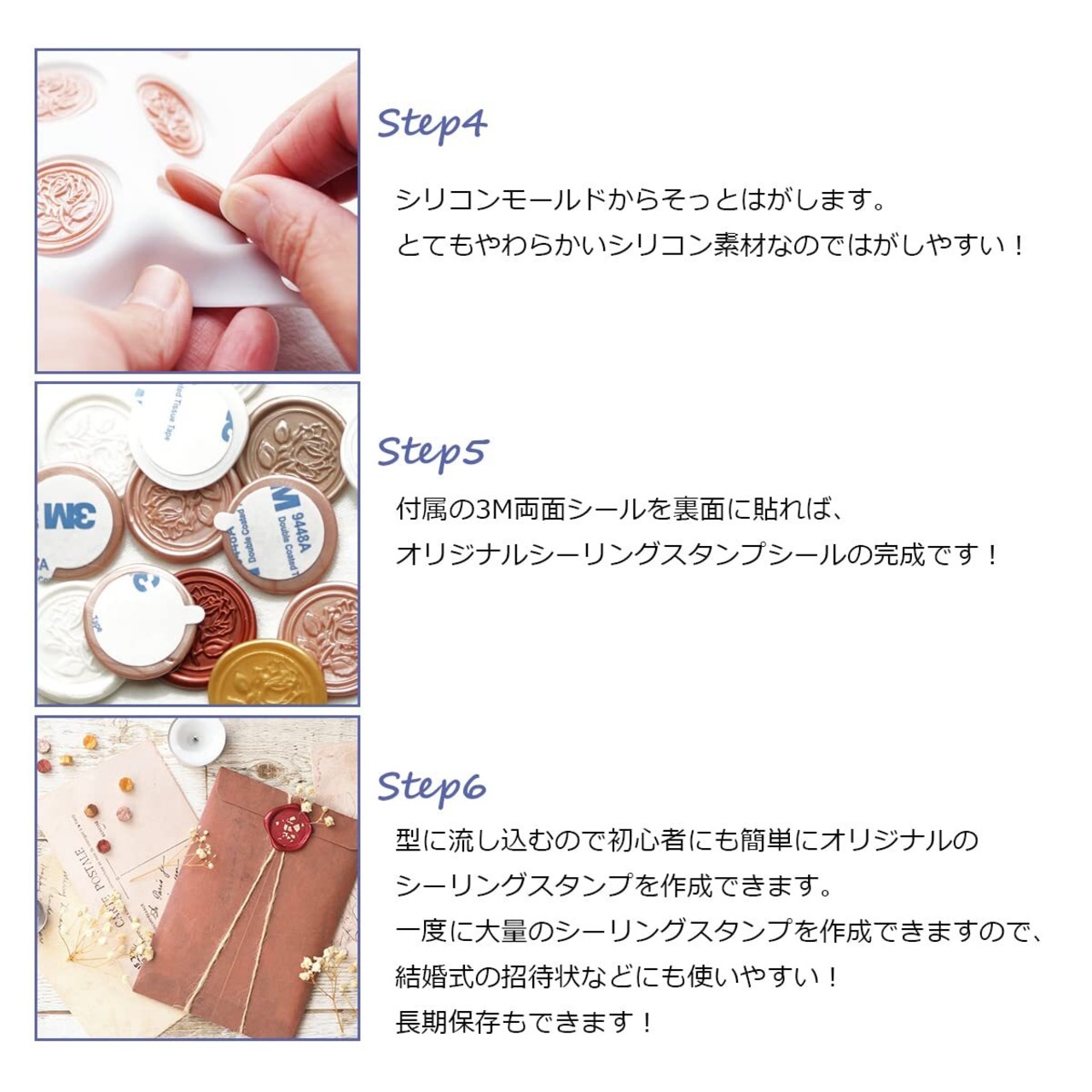 【簡単に綺麗なシーリングスタンプを作成】ワックスを穴に流し込むだけで、綺麗な丸型のシーリングスタンプが作れます。付属の3M両面シールを裏面に貼れば、オリジナルシールの完成です!