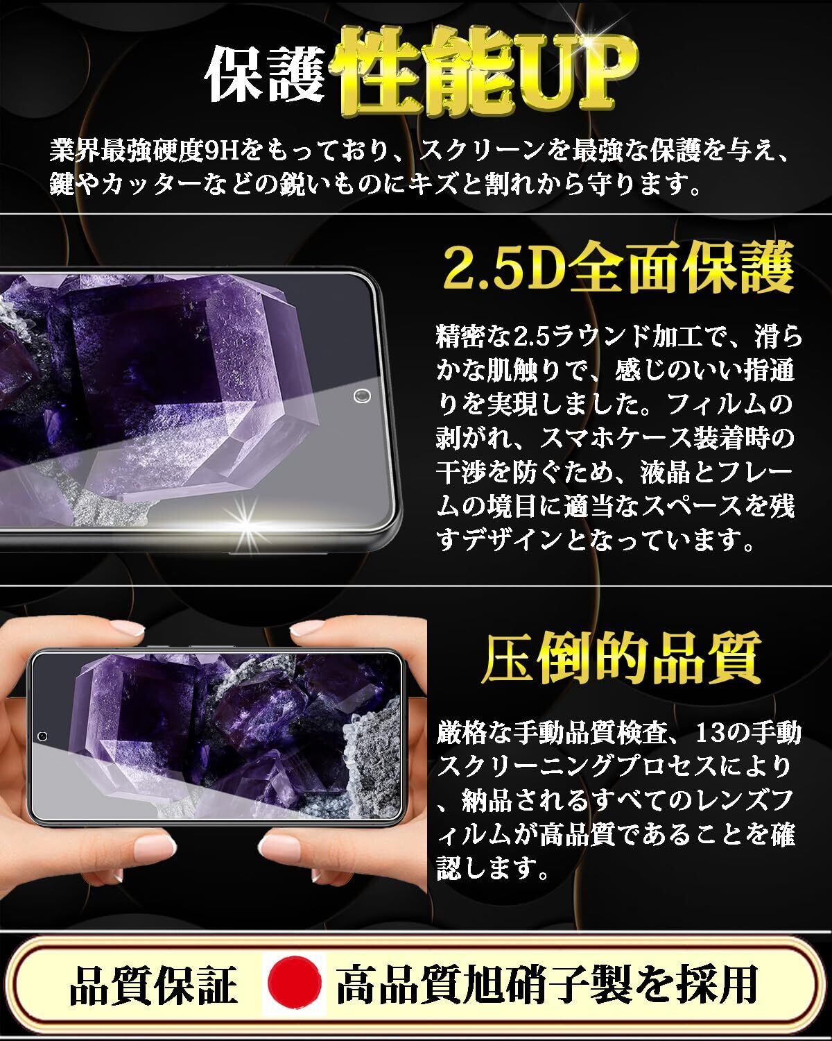 特徴 全面保護,9H表面硬度,飛散防止,防指紋,撥油コーティング,撥水剤,耐衝撃性,ラウンドエッジ,気泡なし,高透過率,簡単貼り付け