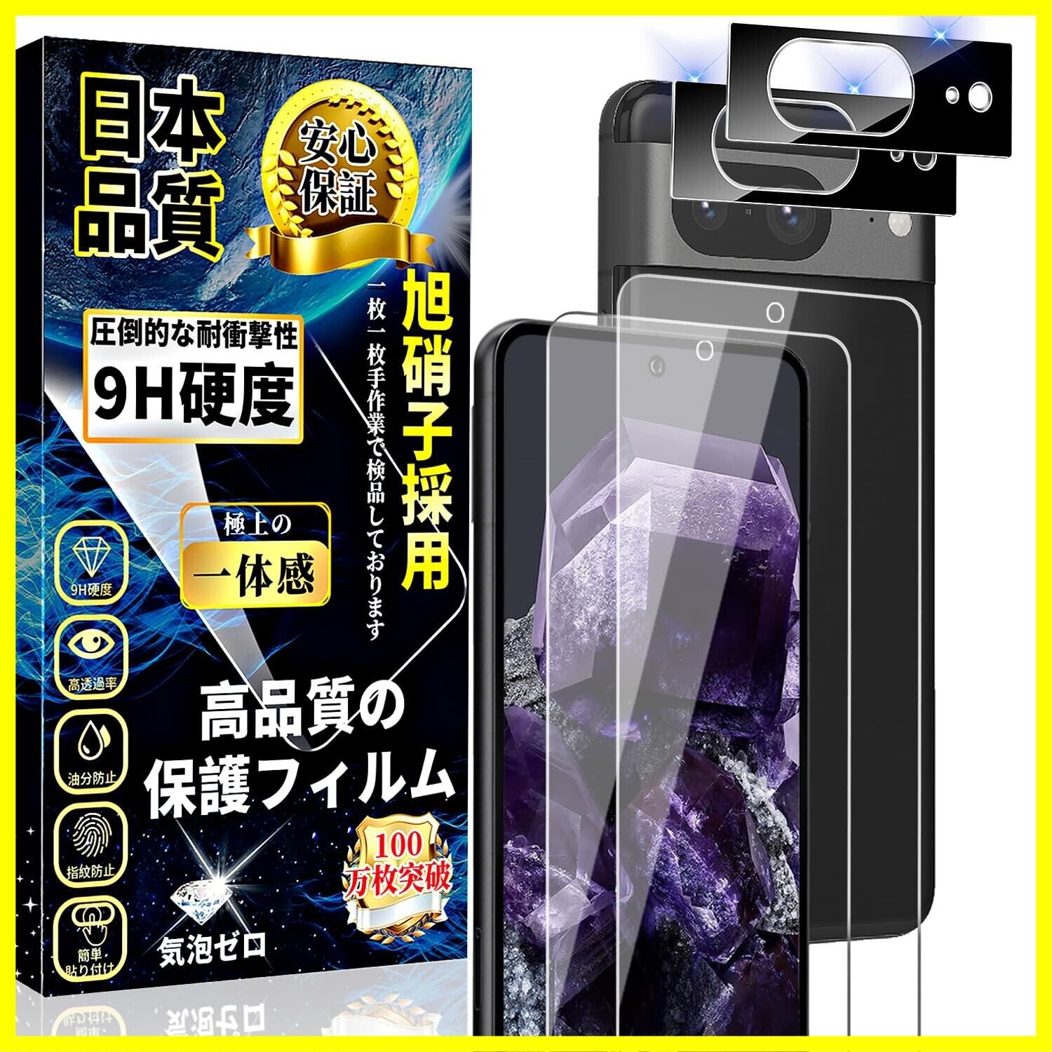 対応 Google Pixel8 ガラスフィルム (2枚)+ Google Pixel8 カメラフィルム (2枚) 液晶保護フィルム 指紋認証対応 旭硝子素材製 硬度9H 高透過率 飛散防止 気泡ゼロ 貼り付け簡単 ピクセル8 保護フィルム+レンズカバー
