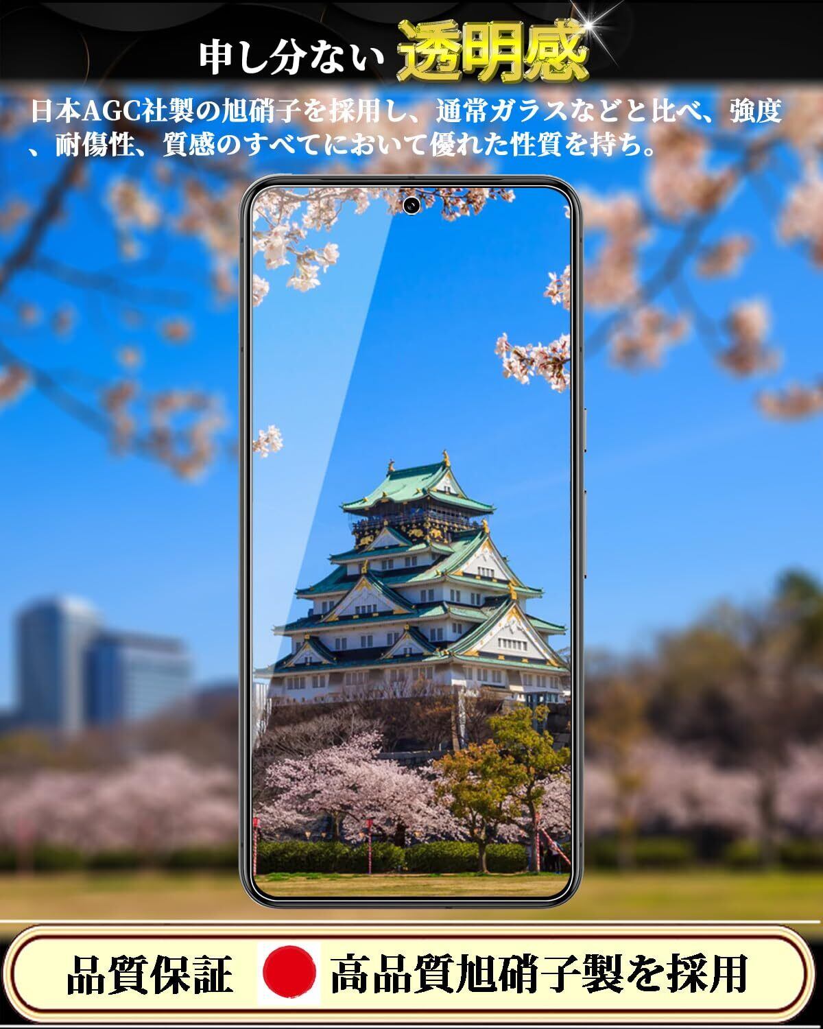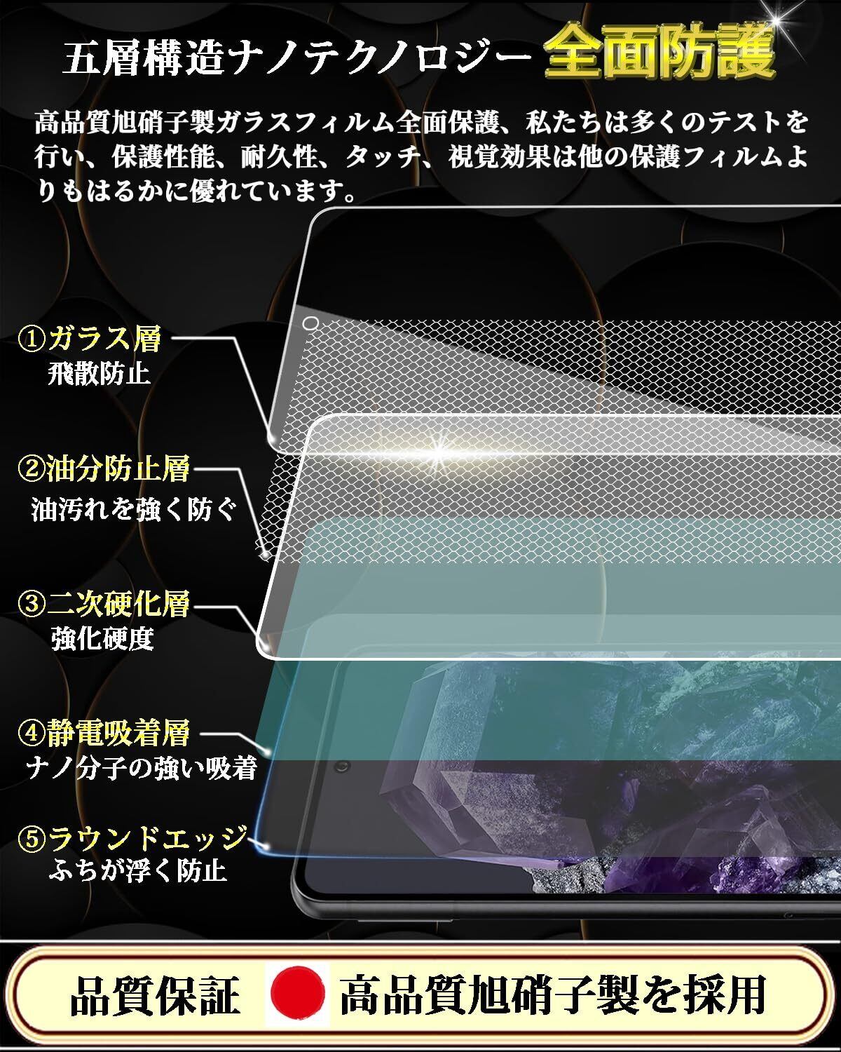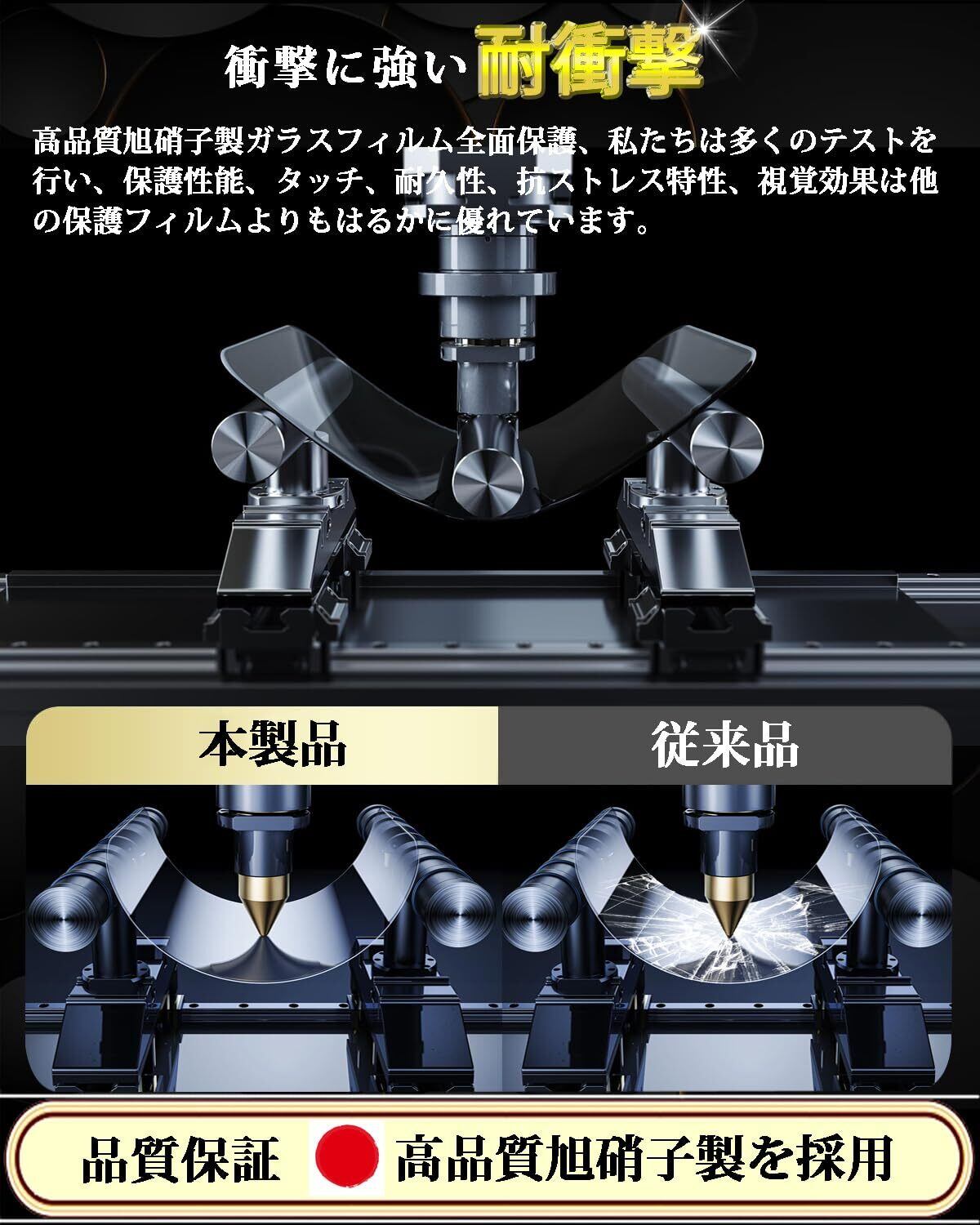 【最強硬度9H・飛散防止】保護ガラス素材は日本旭硝子素材を使用、日本旭硝子社製ガラス素材は通常のPETフィルムより4倍の強度です。スマホのリアルなサイズにより製造、高品質製品の製作プロセスに厳しく基づき、カット加工、精密に彫刻、ライトスイープ、超音波清潔、強化、検査、袋詰め七つのステップを経てスマホに完璧的にフィットした製品を製造されます。