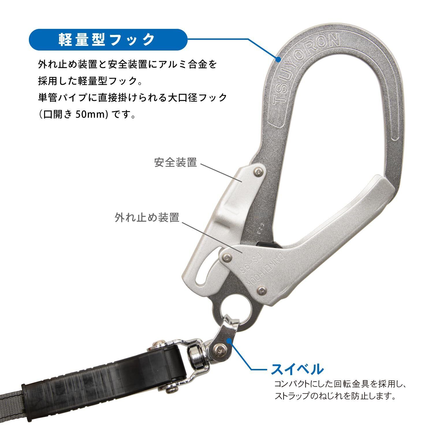 構造物側フック:FS-93SV(軽量・SV回転)、人体側フック:FS-21KS(カラビナ式)