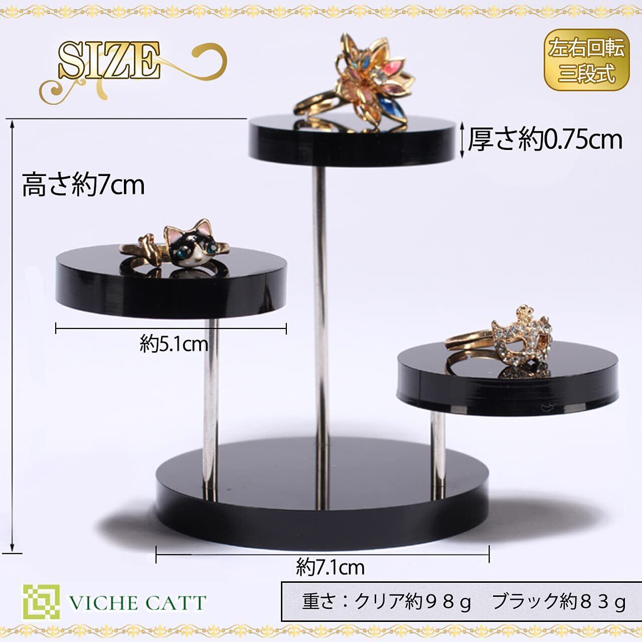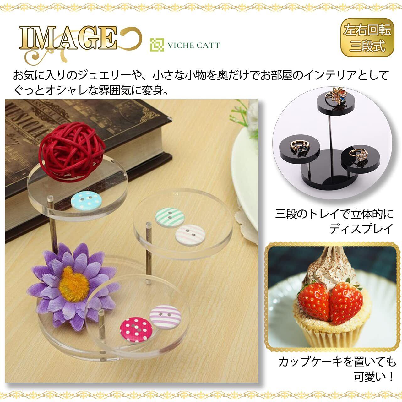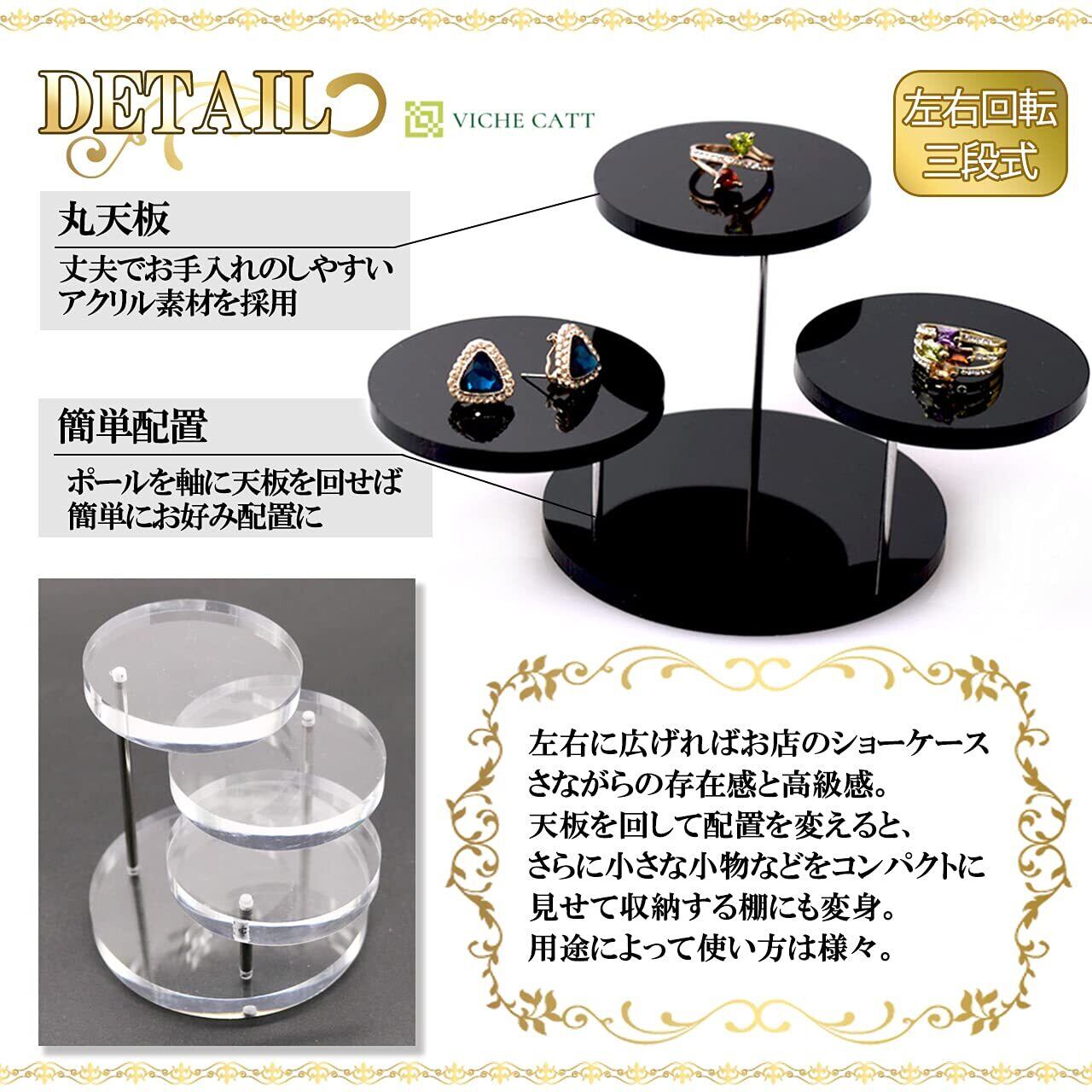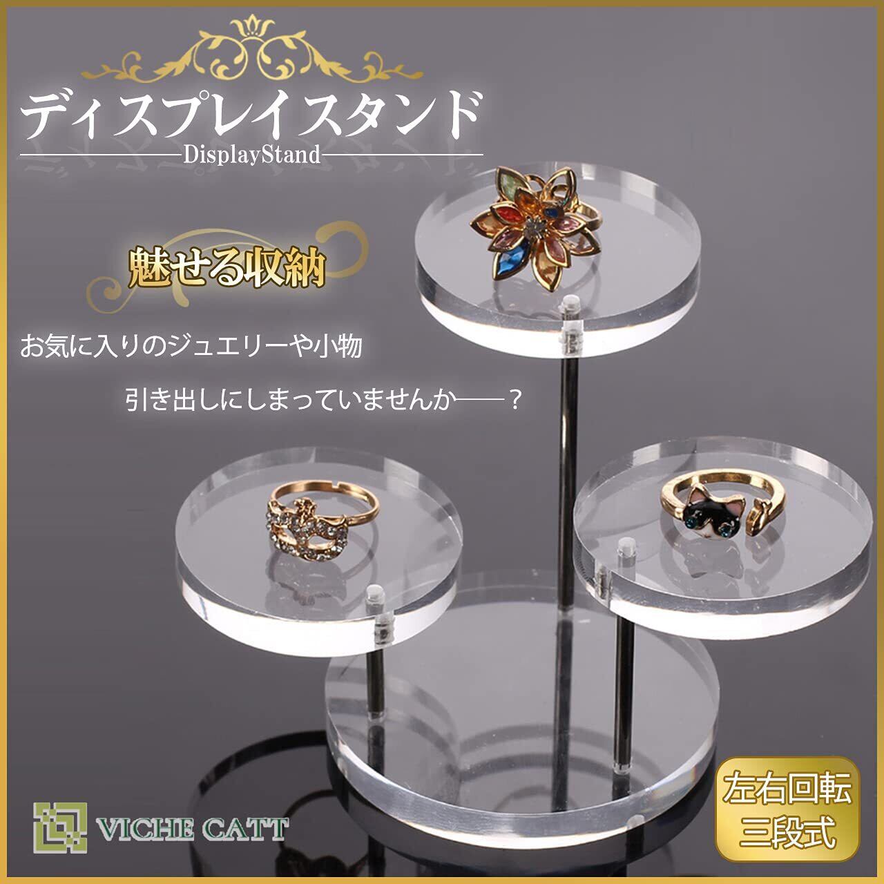 丈夫なアクリル素材で出来た便利な三層回転式ジュエリースタンドです。 すでに組み立てられた状態でおうちに届くので、あとは飾りたい場所にセッティングするだけでご使用いただけます。 つややかなアクリル板を使用しているのでアクセサリーなどの装飾品はもちろんのこと、フィギュアやちょっとした小物も置くだけで高級感漂う雰囲気でディスプレイすることが出来ます。 お手入れも簡単なので、埃が付いたらサッと一拭き。水洗いも可能です。 実際にお店での展示ツールとしてもご使用いただけ、撮影用にも重宝できる立体的なデザインになっております。