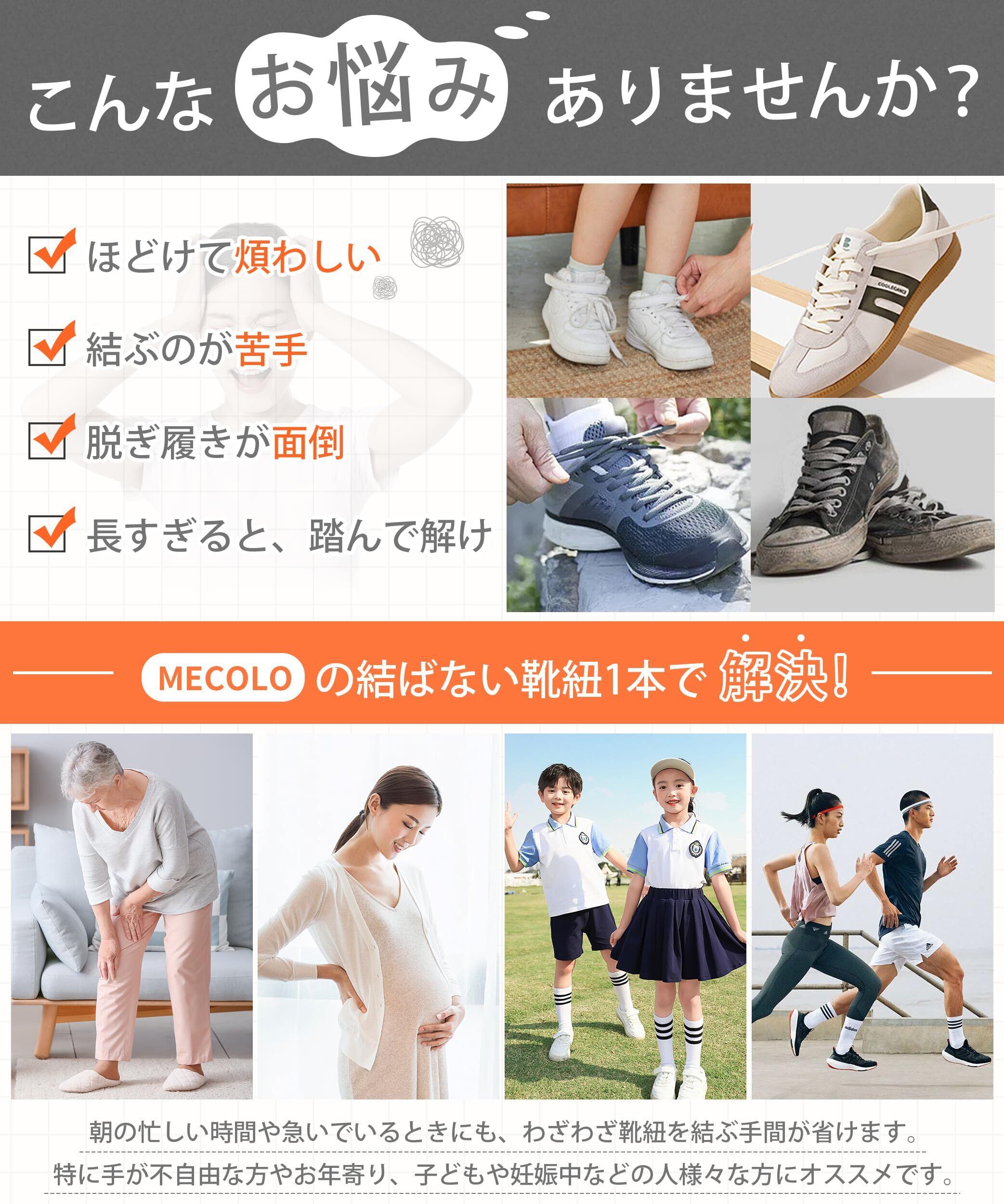 【結ばず&解けず·ワンプッシュで開閉】MECOLOの結ばない靴紐は、ボタンを押すだけでバックルをカチッとはめるだけなので、使い方も一目でわかります。一度締めると、靴ひもを結ぶ手間に振り回されることはありません!伸びるゴム素材ので、スニーカーを履くときはシューズの口を広げて履くだけ!脱ぐときもかかとを固定し、スリッポンのように簡単に脱げます。「脱ぎ」「履き」時間が一気に短縮!1秒でササッと履けて、振ってもほどけない結ばない靴紐です。改良された押しボタン式バックルなら、誰でも簡単にワンプッシュで開閉できます。朝の忙しい時間や急いでいるときにも、わざわざ靴紐を結ぶ手間が省けます。特に手が不自由な方やお年寄り、子どもや妊娠中などの人様々な方にオススメです。「ほどけて煩わしい」「結ぶのが苦手」「脱ぎ履きが面倒」といった悩みを、この結ばない靴紐1本で解決!