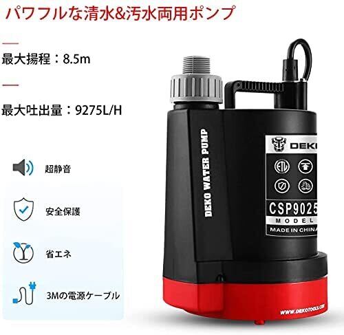 DEKO プラスチック 水中ポンプ 底部入水式 循環ポンプ 最大吐出量9275L/H 最大揚程8.5M 強力 汚水 清水両用 50/60Hz共用 電動 水耕栽培 水槽ウォーターポンプ 水族館給水 排水ポンプ…