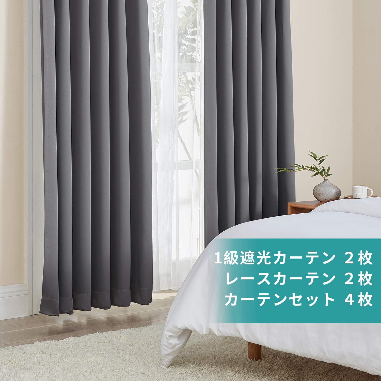 Hansleep カーテン 1級遮光 4枚組 グレー 幅100cm丈135cm UVカット 断熱 防寒 防音 省エネ 厚手 無地 おしゃれ カーテンセット 洗える 寝室 リビング用 (ドレープカーテン2枚・レースカーテン2枚)