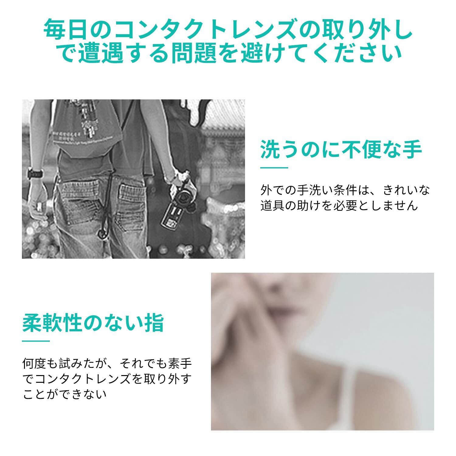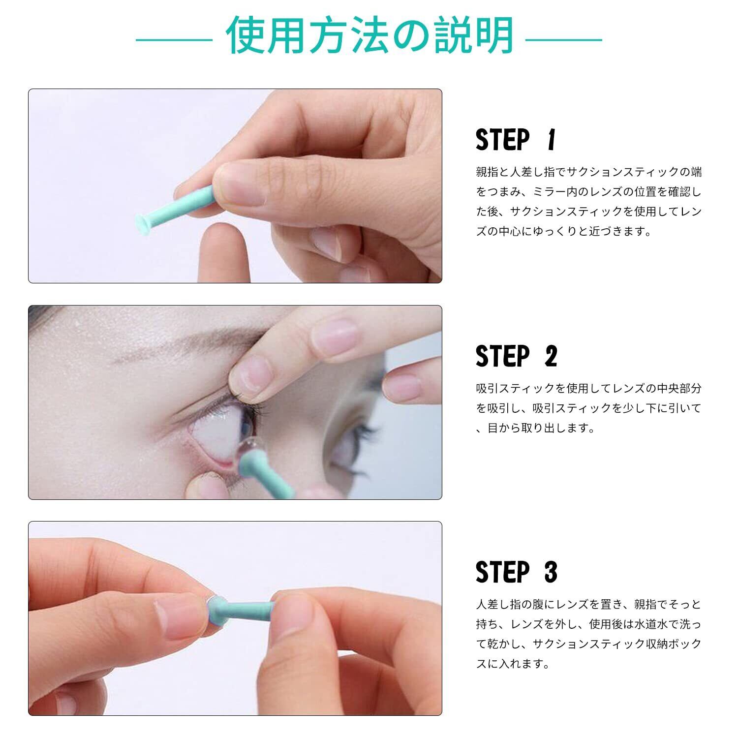 【製品仕様】コンタクトレンズスポイト5個セット、色:緑。 吸着面は柔らかいシリコン素材なので、目に優しく、安全で無毒で洗浄可能です。