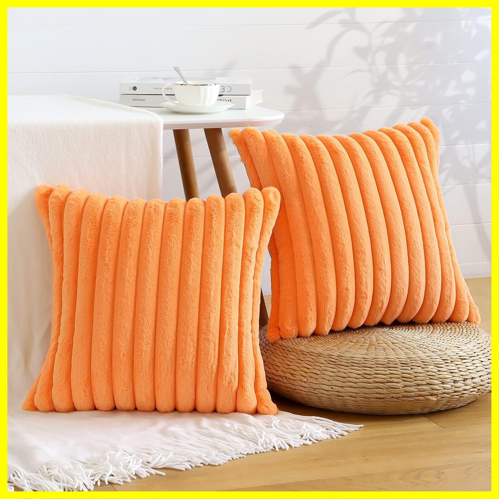 Otostar クッションカバー 45×45cm 2枚セット 北欧 おしゃれ 可愛い ファー フェイクファー ベルベット ふわふわ もふもふ 柔らかい もこもこ ストライプ 立体的 インテリア ソファー用クッションカバー ソファ背当て くっしょんかばー 装飾枕カバー 座布団カバー (45x45, オレンジ)