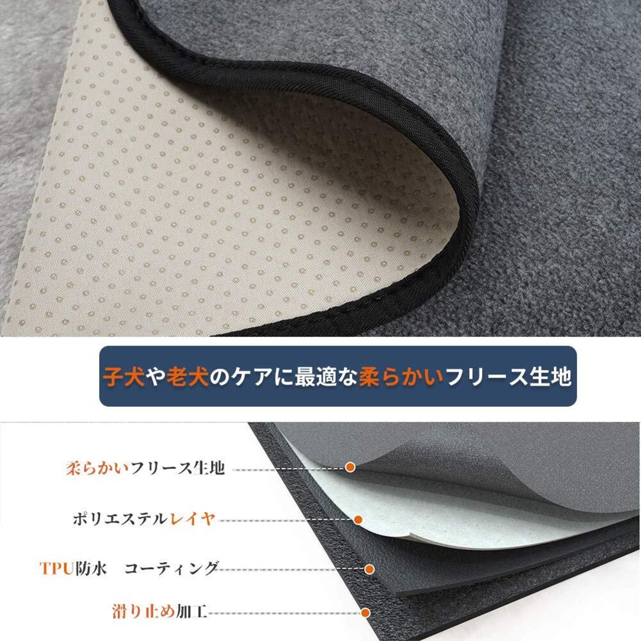 表地は子犬や老犬のケアにも最適な柔らかくて、吸水性の高いフリース生地。真ん中はポリエステルレイヤに防水コーティング。下に浸透する心配はありません。裏面はズレにくいノンスリップ仕上げ。滑りやすいフローリングでの転倒を防止します。ズレが原因の汚れから開放されます