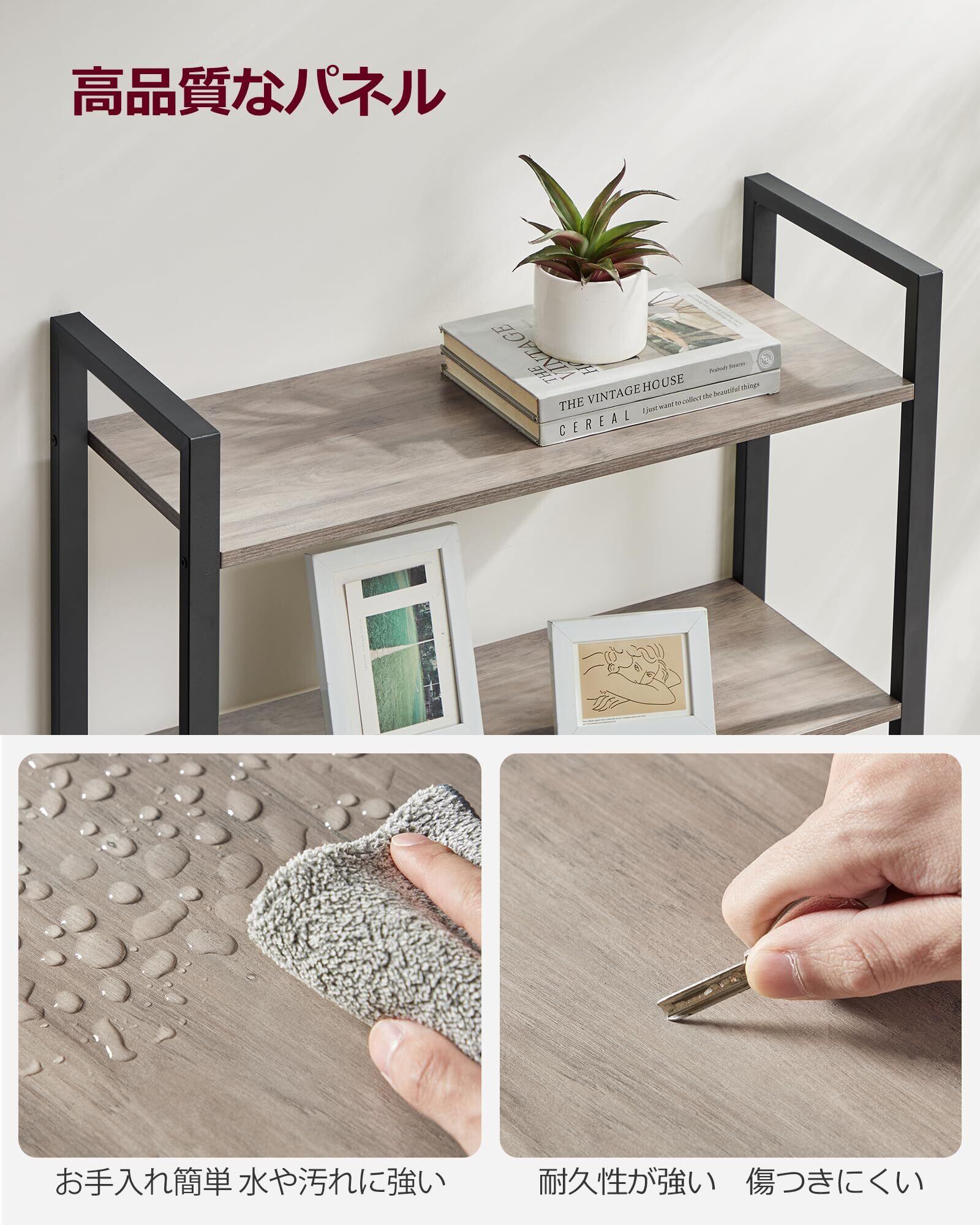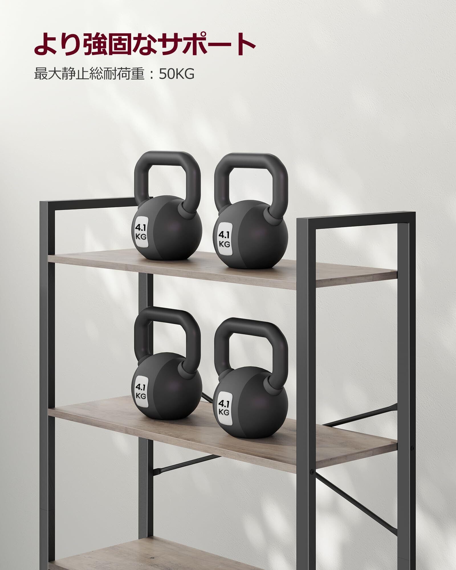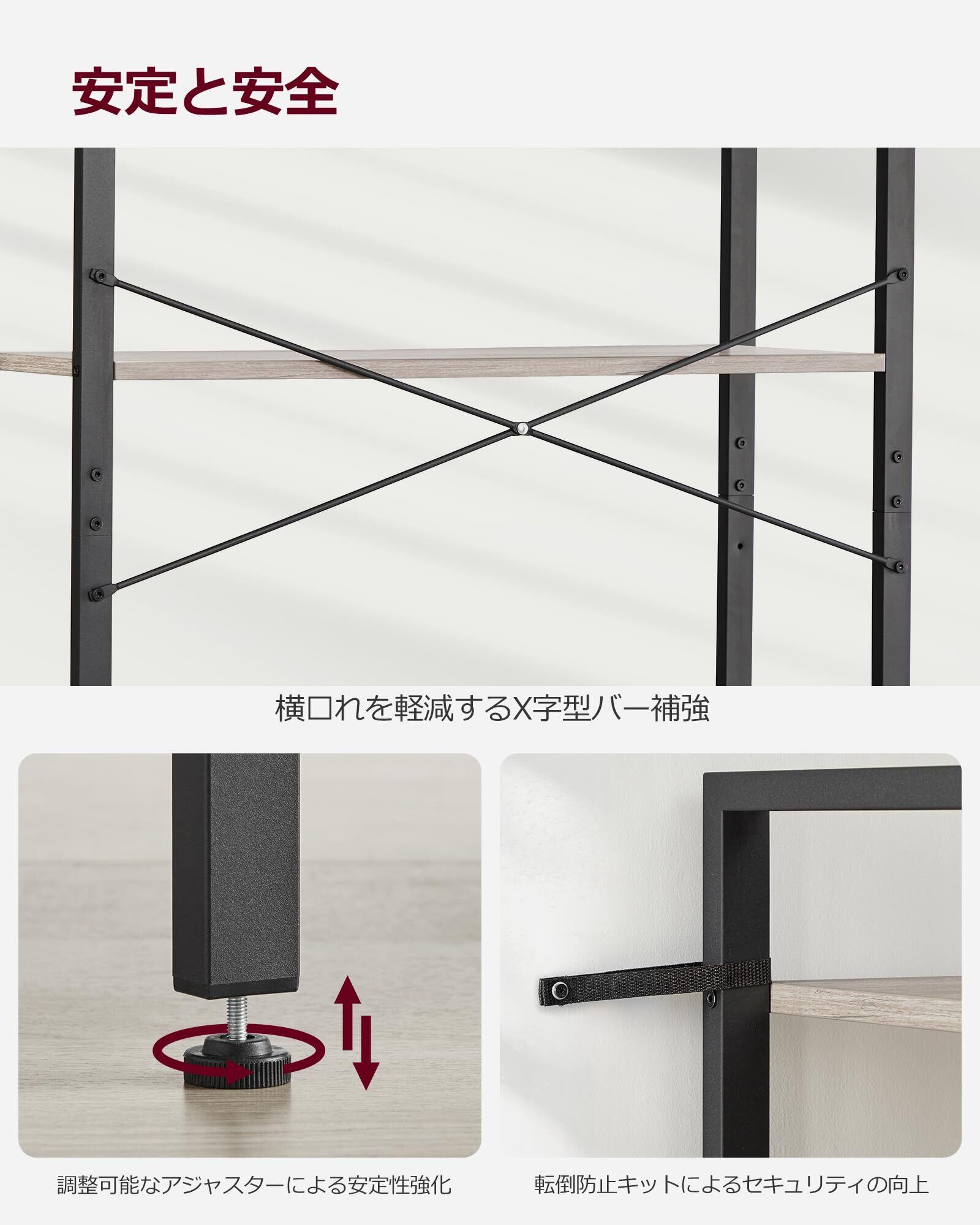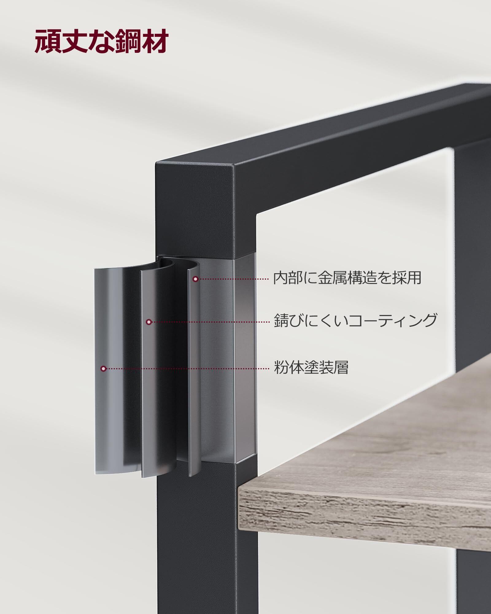 【頑丈なフレーム】細身の金属製骨組みは安定感があり、棚あたり10Kgまで耐えられます。脚部にアジャスター付き、足の高さを微調整できるので、平らでない場所でも安定します