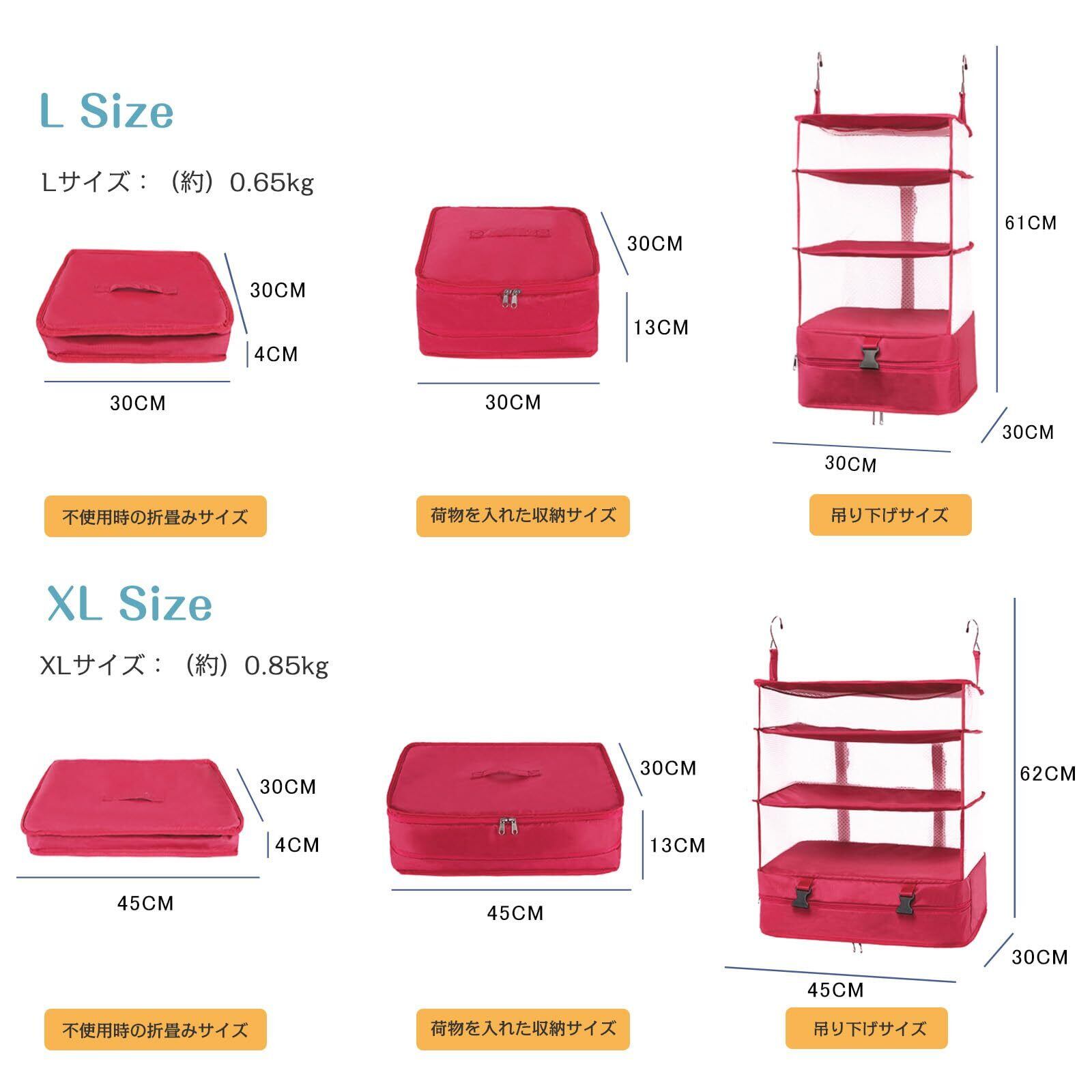【素材】ポリエステル 【カラー】ブラック ブルー グレー ローズ カチオングレー 【吊り下げサイズ】Lサイズ:30*30*61CM XLサイズ:45*30*62CM 【荷物を入れた収納サイズ】Lサイズ:30*30*13CM XLサイズ:45*30*13CM 【不使用時の折畳みサイズ】Lサイズ:30*30*4CM XLサイズ:45*30*4CM