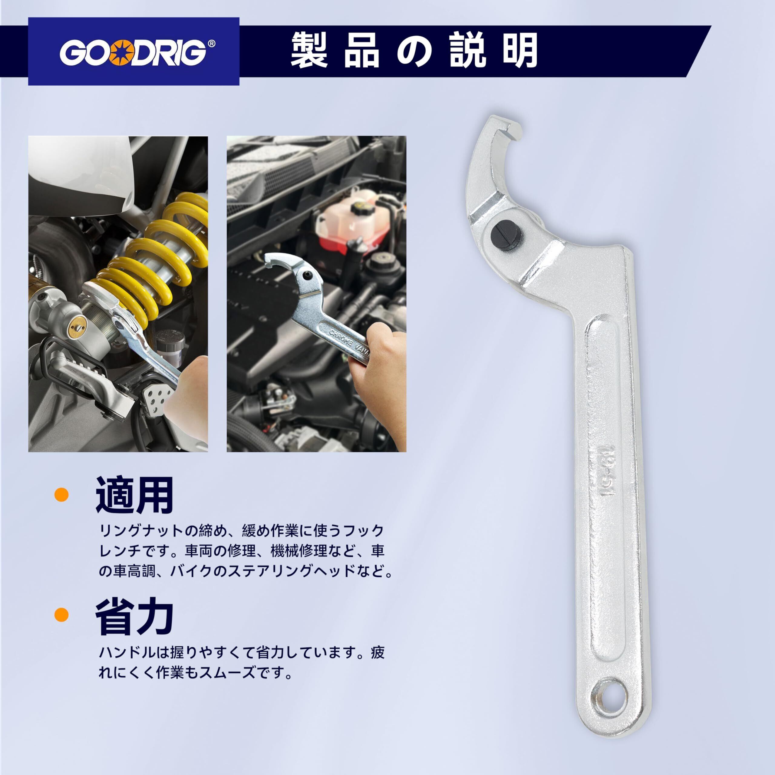 【適用】:リングナットの締め、緩め作業に使うフックレンチです。車両の修理、機械修理など、車の車高調、バイクのステアリングヘッドなど。
