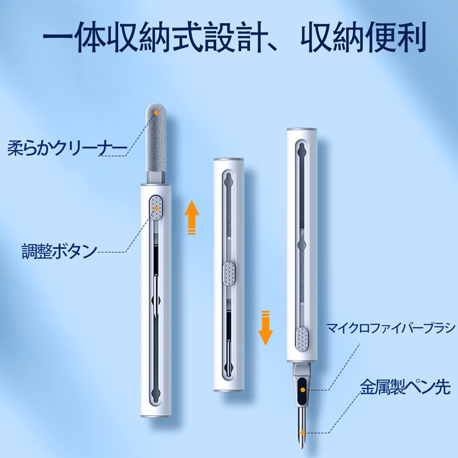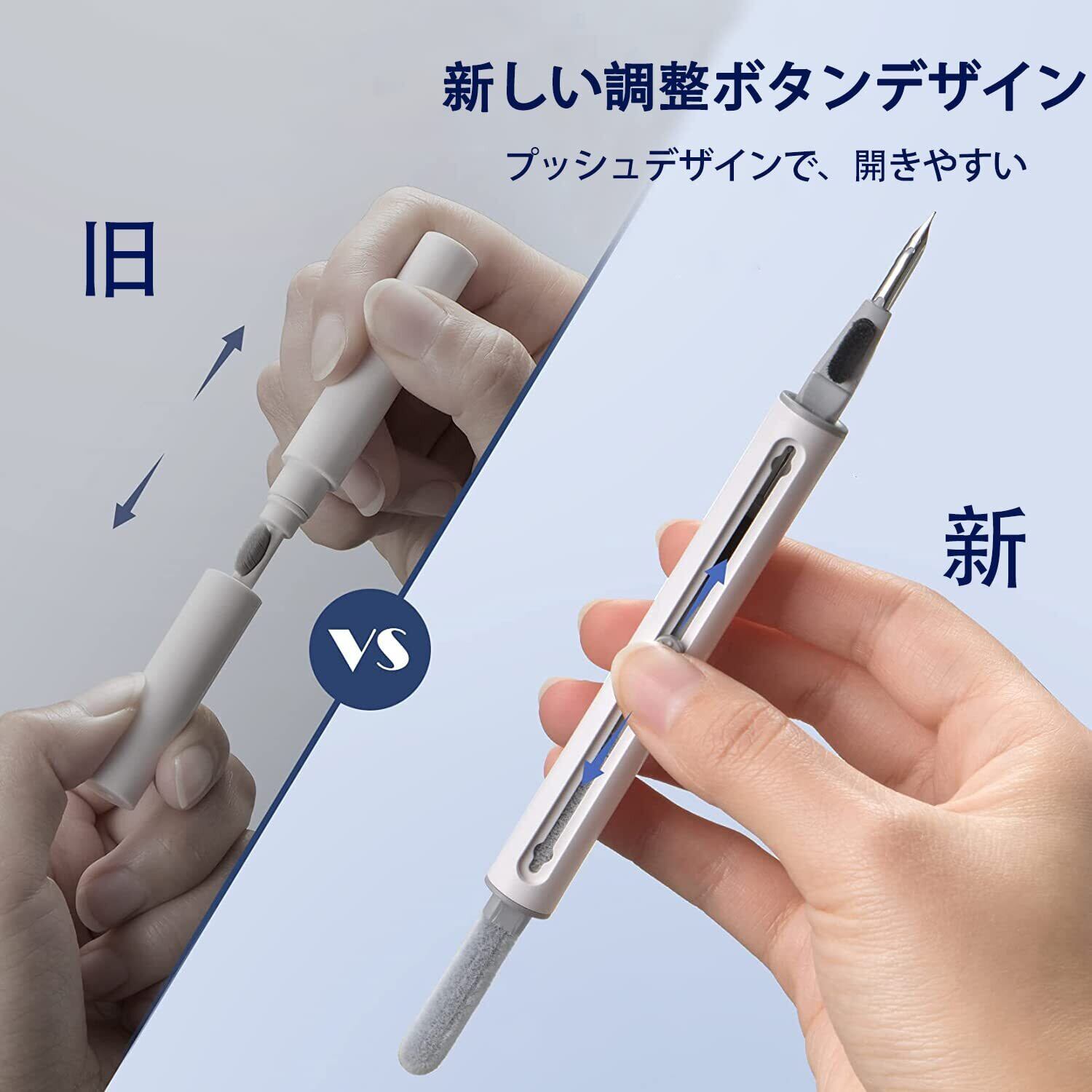 【一体収納式設計、収納便利】一体収納式設計されたイヤホンクリーニングペンです。イヤホンクリーニングペンの中部位置にボタンがついており、ボタンを上下に押して、イヤホンクリーニングペンのなかに収納されているペン先やスポンジが出てきます。未使用時は収納できてとても便利です。