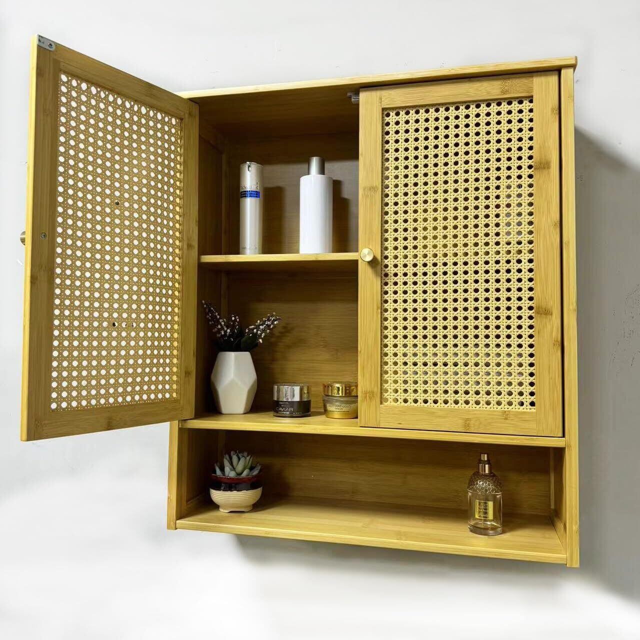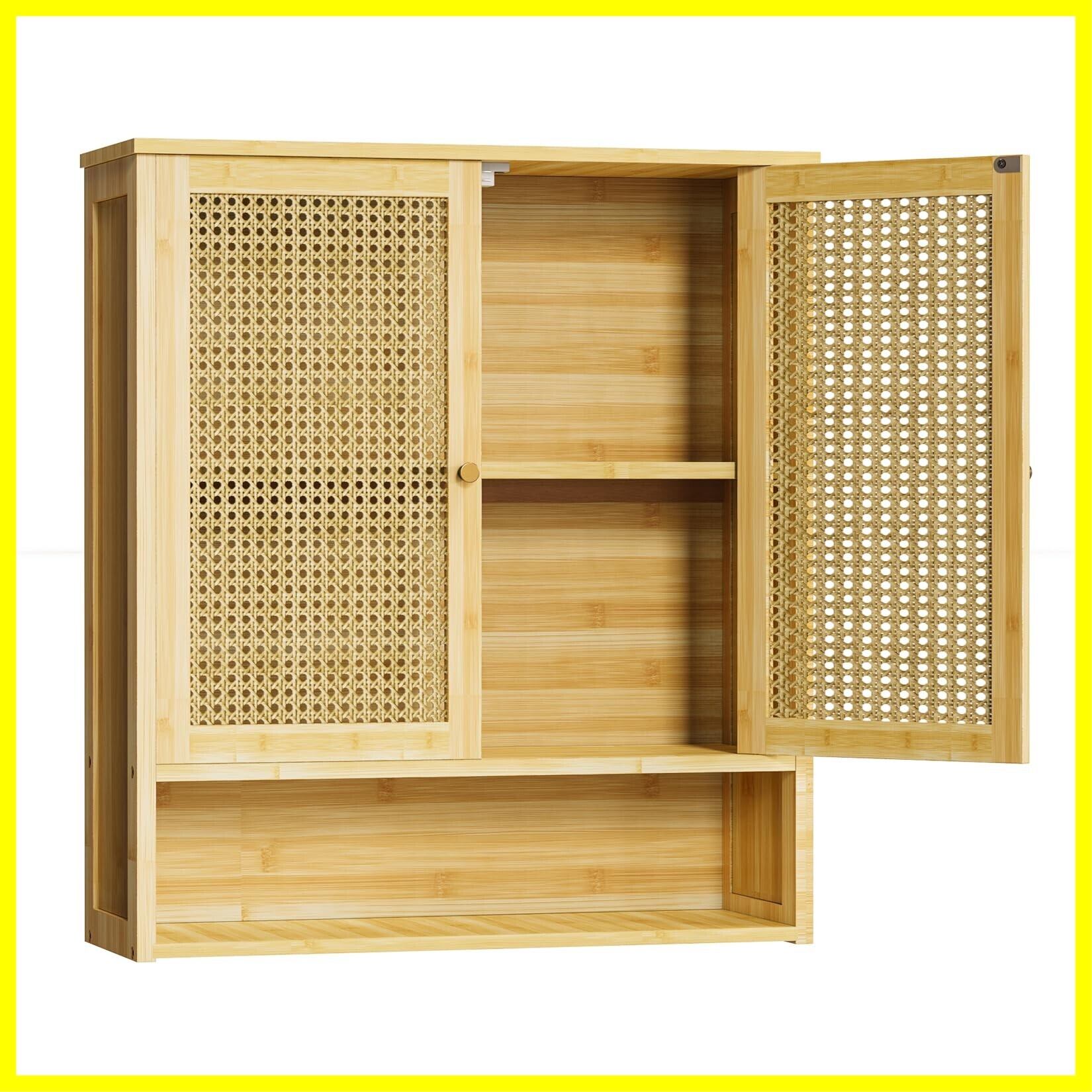 UNHO 吊り戸棚 ラタン調 木製 壁掛けキャビネット 編目 扉付き 奥行き20cm 観音開き トイレ ウォールシェルフ キッチン 後付け 壁面収納 薄型 幅60cm 北欧 リビング 玄関 洗面所 ネジ止め 地震対策