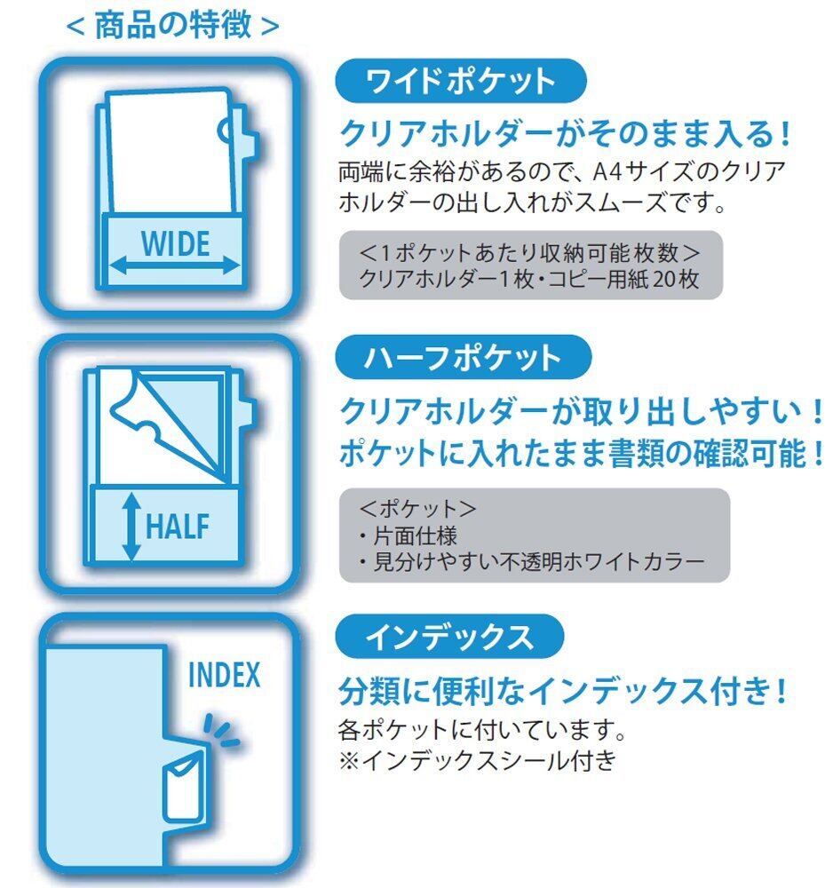 収納枚数:クリアホルダー8枚・A4コピー用紙約160枚(64g/㎡程度)(1ポケット・クリアホルダー1枚・A4コピー用紙20枚収納)