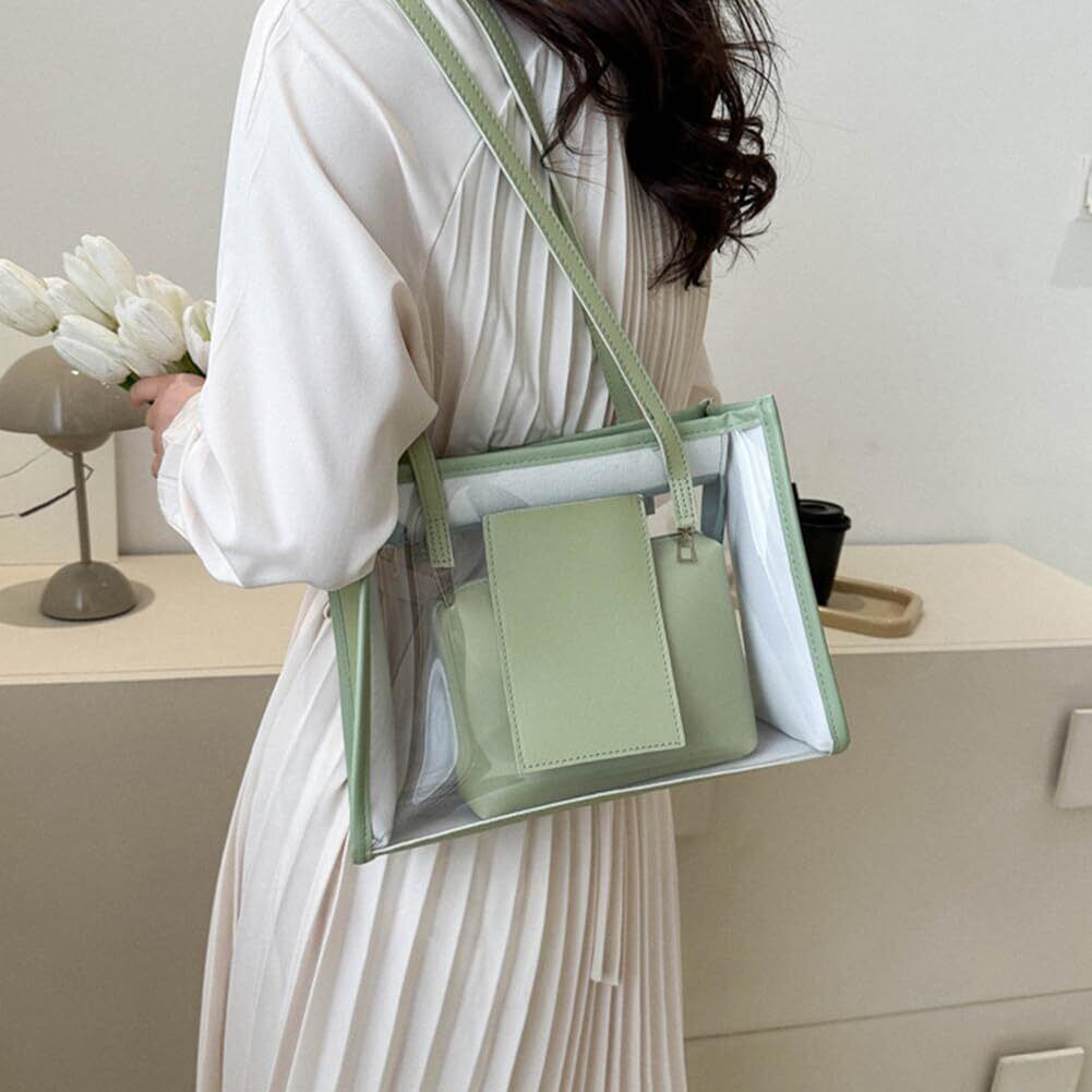【仕様】製品名前:片面透明・トートバッグ(インナーポーチ付)。素材:PU(手提げストラップ、インナーポーチ)、PVC。サイズ:PVCバッグ:上幅28cm、底幅29cm、高さ22cm、厚さ10.5cm。インナーポーチ:上幅17.5cm、底幅17.5cm、高さ14cm、厚さ6cm。手提げストラップ高さは31cm。重量:インナーポーチ0.08kg、PVCバッグ0.33kg。カラー:グリーン。